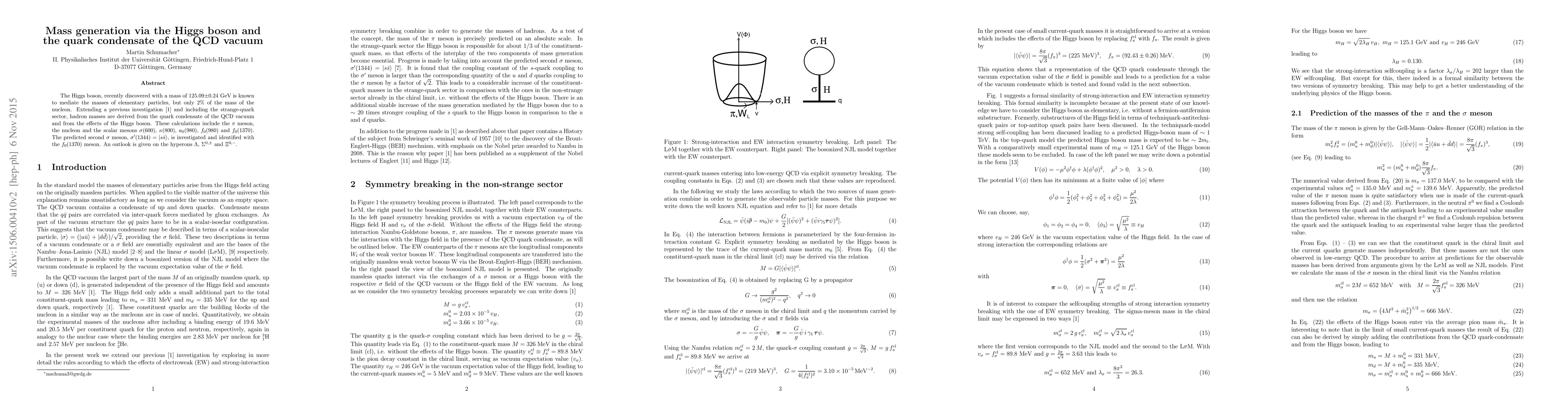 The Higgs boson, recently discovered with a mass of 125.09$\pm$0.24 GeV is known to mediate the masses of elementary particles, but only 2% of the mass of the nucleon. Extending a previous investigation [1] and including the strange-quark sector, hadron masses are derived from the quark condensate of the QCD vacuum and from the effects of the Higgs boson. These calculations include the $\pi$ meson, the nucleon and the scalar mesons $\sigma(600)$, $\kappa(800)$, $a_0(980)$ $f_0(980)$ and $f_0(1370)$. The predicted second $\sigma$ meson $\sigma'(1344)=|s\bar{s}\rangle$, is investigated and identified with the $f_0(1370)$ meson. An outlook is given on the hyperons $\Lambda$, $\Sigma^{0,\pm}$ and $\Xi^{0,-}$.