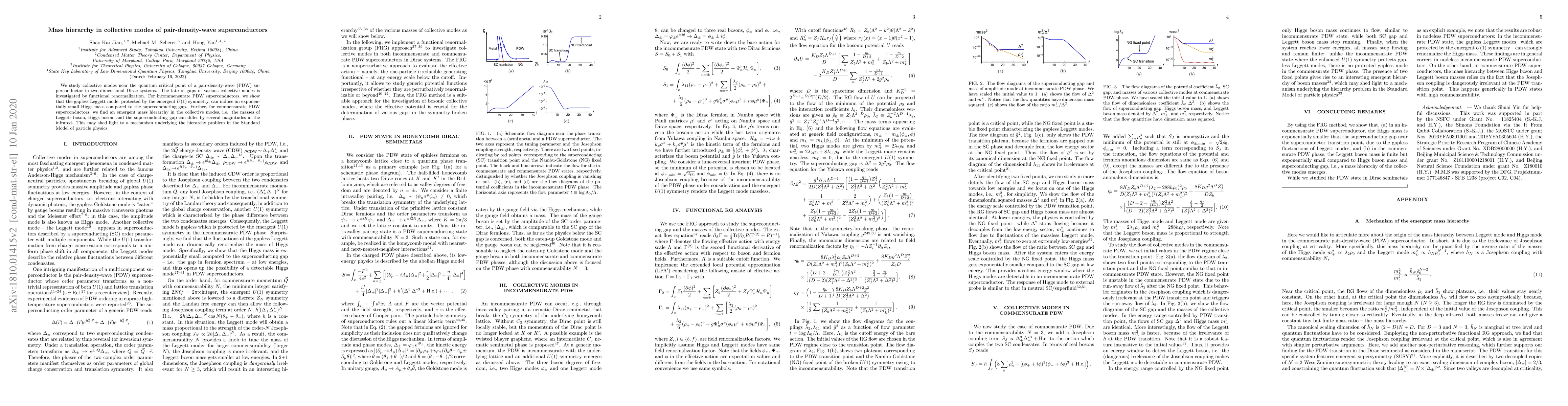 This research investigates collective modes near the quantum critical point in pair-density-wave superconductors, revealing that the gapless Leggett mode can induce a small Higgs mass. For commensurate PDW superconductors, it uncovers a mass hierarchy among collective modes, potentially providing insight into the hierarchy problem in particle physics.