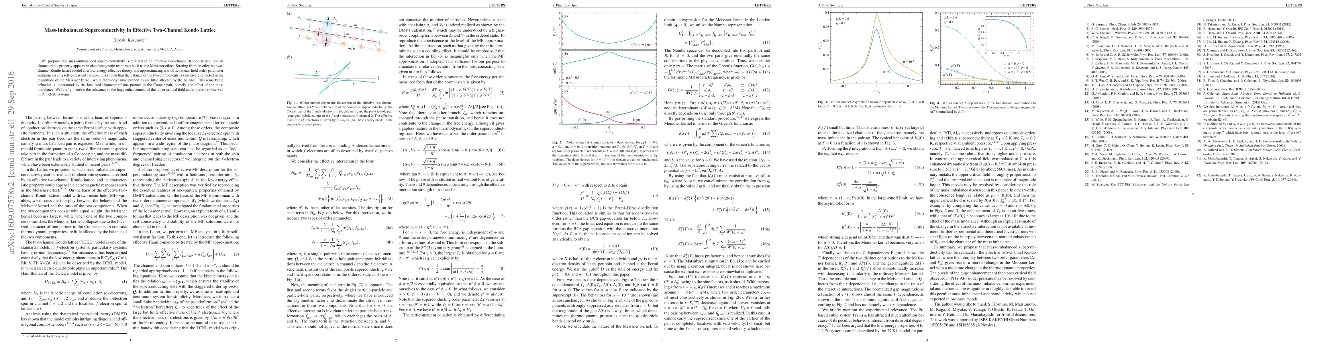 This paper explores mass-imbalanced superconductivity in an effective two-channel Kondo lattice, demonstrating that the balance between two mean-field order parameters significantly influences the Meissner effect while having minimal impact on thermodynamic properties, due to the localized nature of one Cooper pair component. The findings are relevant to the observed enhancement of the upper critical field in Pr 1-2-20 systems.