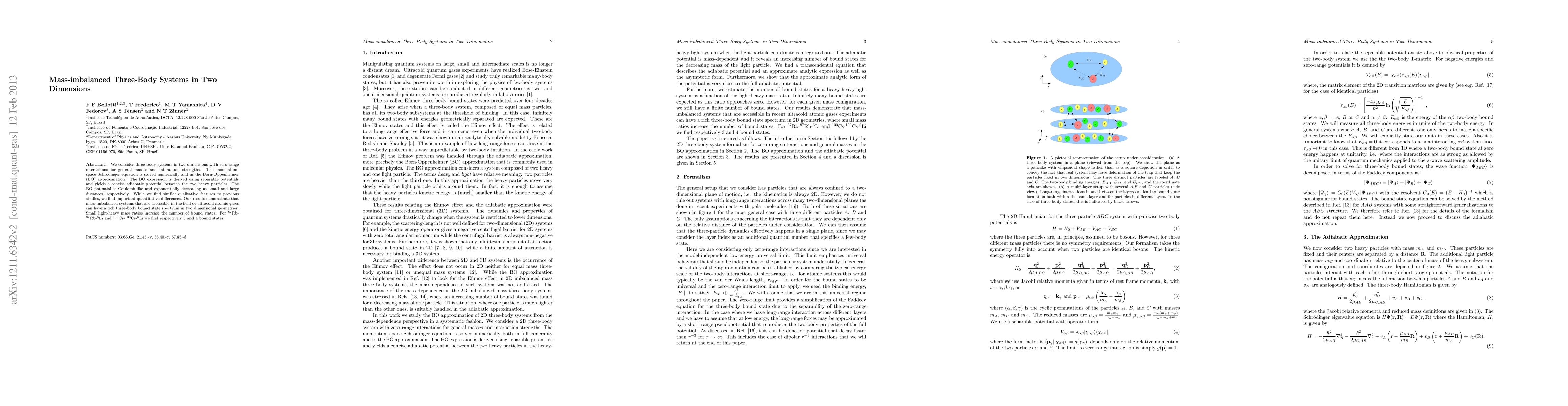 We consider three-body systems in two dimensions with zero-range interactions for general masses and interaction strengths. The momentum-space Schr\"odinger equation is solved numerically and in the Born-Oppenheimer (BO) approximation. The BO expression is derived using separable potentials and yields a concise adiabatic potential between the two heavy particles. The BO potential is Coulomb-like and exponentially decreasing at small and large distances, respectively. While we find similar qualitative features to previous studies, we find important quantitative differences. Our results demonstrate that mass-imbalanced systems that are accessible in the field of ultracold atomic gases can have a rich three-body bound state spectrum in two dimensional geometries. Small light-heavy mass ratios increase the number of bound states. For 87Rb-87Rb-6Li and 133Cs-133Cs-6Li we find respectively 3 and 4 bound states.