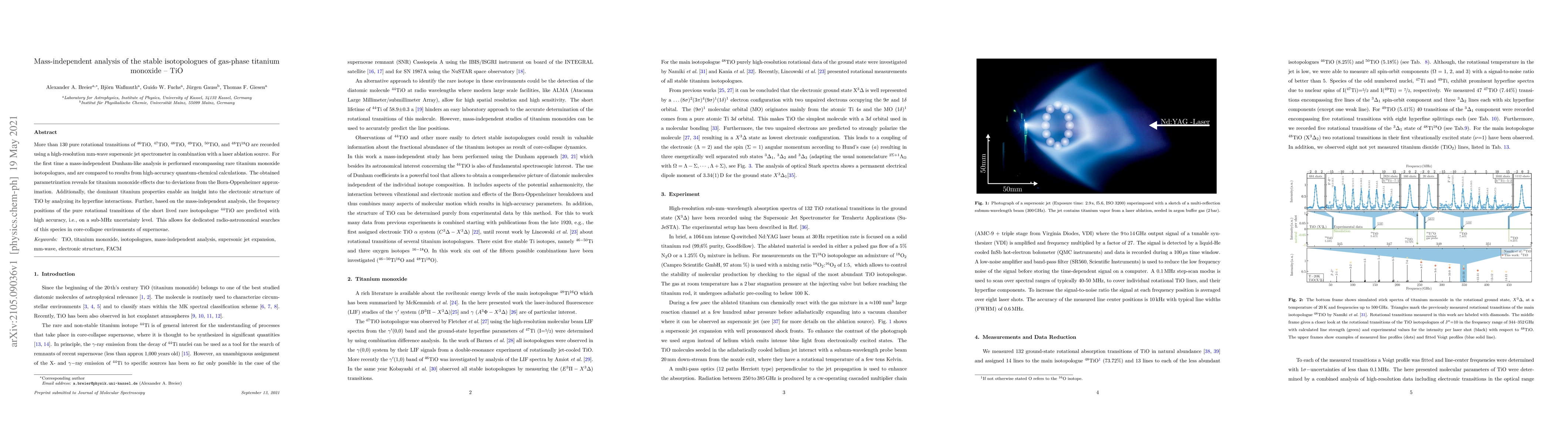 More than 130 pure rotational transitions of $^{46}$TiO, $^{47}$TiO, $^{48}$TiO, $^{49}$TiO, $^{50}$TiO, and $^{48}$Ti$^{18}$O are recorded using a high-resolution mm-wave supersonic jet spectrometer in combination with a laser ablation source. For the first time a mass-independent Dunham-like analysis is performed encompassing rare titanium monoxide isotopologues, and are compared to results from high-accuracy quantum-chemical calculations. The obtained parametrization reveals for titanium monoxide effects due to deviations from the Born-Oppenheimer approximation. Additionally, the dominant titanium properties enable an insight into the electronic structure of TiO by analyzing its hyperfine interactions. Further, based on the mass-independent analysis, the frequency positions of the pure rotational transitions of the short lived rare isotopologue $^{44}$TiO are predicted with high accuracy, i.e., on a sub-MHz uncertainty level. This allows for dedicated radio-astronomical searches of this species in core-collapse environments of supernovae.