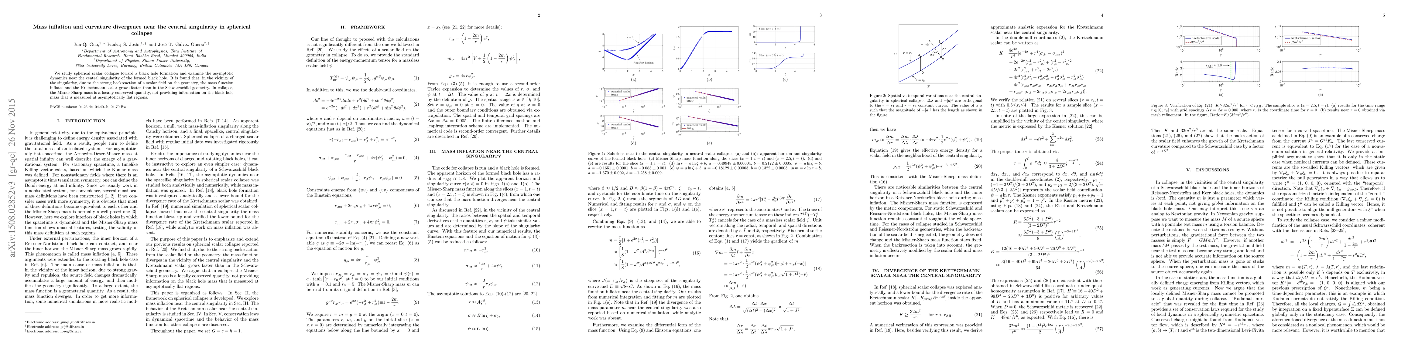 This paper investigates the dynamics of spherical scalar collapse leading to black hole formation, revealing that mass inflation and curvature divergence occur near the central singularity due to the scalar field's strong backreaction on spacetime geometry. The Misner-Sharp mass, while locally conserved, fails to reflect the black hole mass measured in asymptotically flat regions.