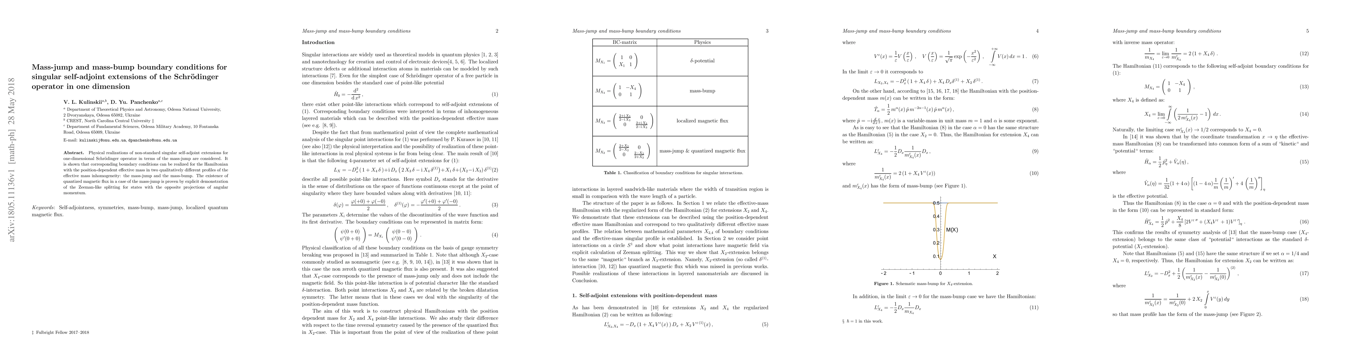 This paper explores singular self-adjoint extensions of the one-dimensional Schrödinger operator through mass-jump and mass-bump boundary conditions. It demonstrates the existence of quantized magnetic flux via Zeeman-like splitting for states with opposite angular momentum projections in the mass-jump scenario.