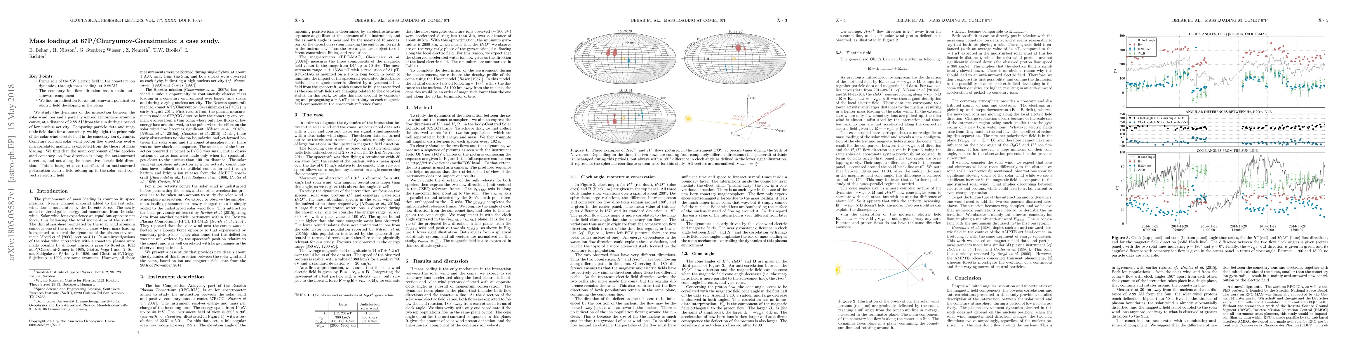 We study the dynamics of the interaction between the solar wind ions and a partially ionized atmosphere around a comet, at a distance of 2.88 AU from the sun during a period of low nucleus activity. Comparing particle data and mag- netic field data for a case study, we highlight the prime role of the solar wind electric field in the cometary ion dynamics. Cometary ion and solar wind proton flow directions evolve in a correlated manner, as expected from the theory of mass loading. We find that the main component of the acceler- ated cometary ion flow direction is along the anti-sunward direction, and not along the convective electric field direc- tion. This is interpreted as the effect of an anti-sunward polarisation electric field adding up to the solar wind con- vective electric field.