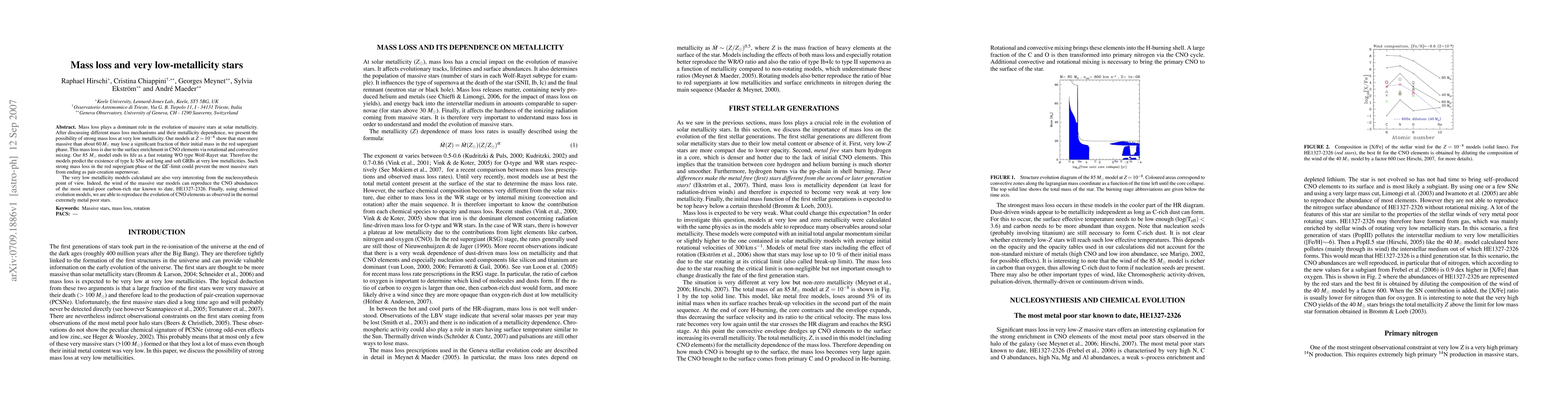 Mass loss plays a dominant role in the evolution of massive stars at solar metallicity. After discussing different mass loss mechanisms and their metallicity dependence, we present the possibility of strong mass loss at very low metallicity. Our models at Z=1e-8 show that stars more massive than about 60 solar masses may lose a significant fraction of their initial mass in the red supergiant phase. This mass loss is due to the surface enrichment in CNO elements via rotational and convective mixing. Our 85 solar mass model ends its life as a fast rotating WO type Wolf-Rayet star. Therefore the models predict the existence of type Ic SNe and long and soft GRBs at very low metallicities. Such strong mass loss in the red supergiant phase or the Omega-Gamma limit could prevent the most massive stars from ending as pair-creation supernovae. The very low metallicity models calculated are also very interesting from the nucleosynthesis point of view. Indeed, the wind of the massive star models can reproduce the CNO abundances of the most metal-poor carbon-rich star known to date, HE1327-2326. Finally, using chemical evolution models, we are able to reproduce the evolution of CNO elements as observed in the normal extremely metal poor stars.