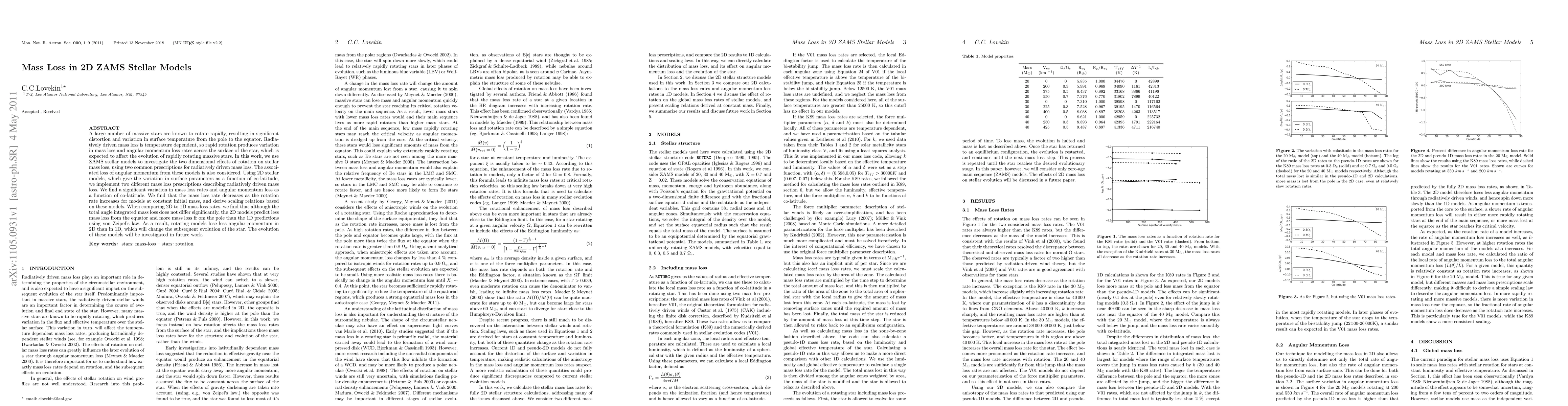A large number of massive stars are known to rotate, resulting in significant distortion and variation in surface temperature from the pole to the equator. Radiatively driven mass loss is temperature dependent, so rapid rotation produces variation in mass loss and angular momentum loss rates across the surface of the star, which is expected to affect the evolution of rapidly rotating massive stars. In this work, we investigate the two dimensional effects of rotation on radiatively driven mass loss and the associated loss of angular momentum in ZAMS models with solar metallicity. Using 2D stellar models, which give the variation in surface parameters as a function of co-latitude, we implement two different mass loss prescriptions describing radiatively driven mass loss. We find a significant variation in mass loss rates and angular momentum loss as a function of co-latitude. We find that the mass loss rate decreases as the rotation rate increases for models at constant initial mass, and derive scaling relations based on these models. When comparing 2D to 1D mass loss rates, we find that although the total angle integrated mass loss does not differ significantly, the 2D models predict less mass loss from the equator and more mass loss from the pole than the 1D predictions using von Zeipel's law. As a result, rotating models lose less angular momentum in 2D than in 1D, which will change the subsequent evolution of the star. The evolution of these models will be investigated in future work.