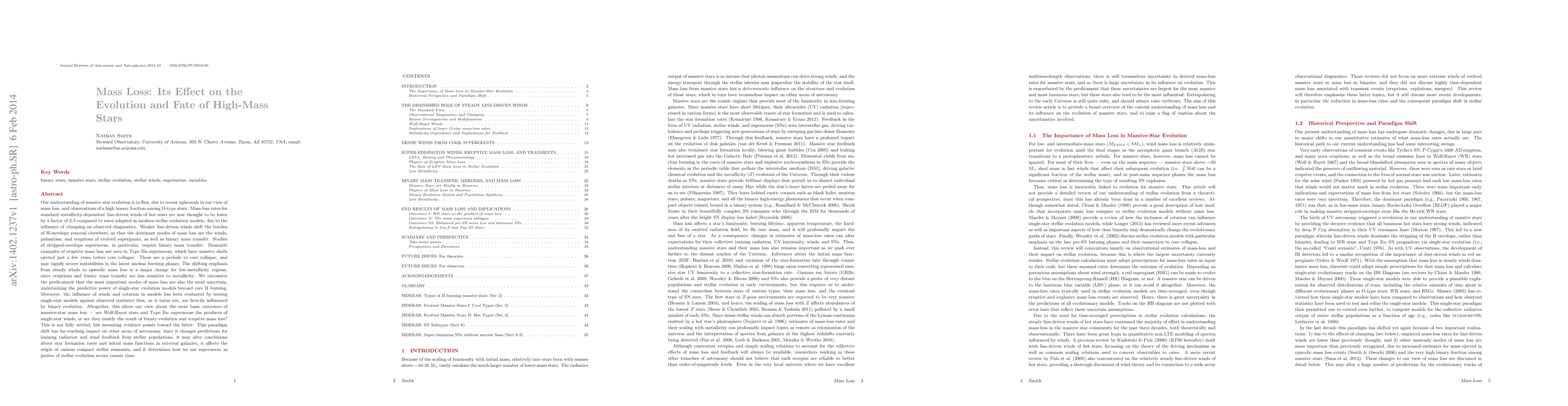 This paper discusses the evolving understanding of mass loss in high-mass stars, revealing that recent observations suggest lower mass-loss rates than previously thought, primarily due to clumping effects. The shift from steady winds to episodic mass loss, including binary mass transfer and eruptive phenomena, significantly impacts the evolution and fate of these stars, challenging the predictive power of single-star models.