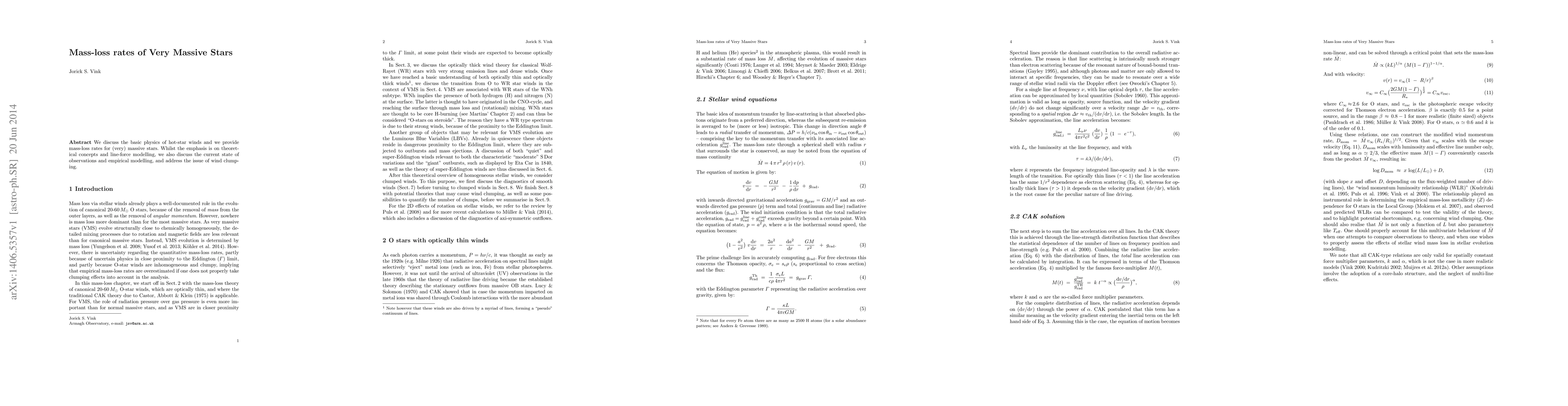 This paper explores the fundamental physics of hot-star winds and presents mass-loss rates for very massive stars, focusing on theoretical line-force models and discussing observational and empirical modeling, alongside the phenomenon of wind clumping.