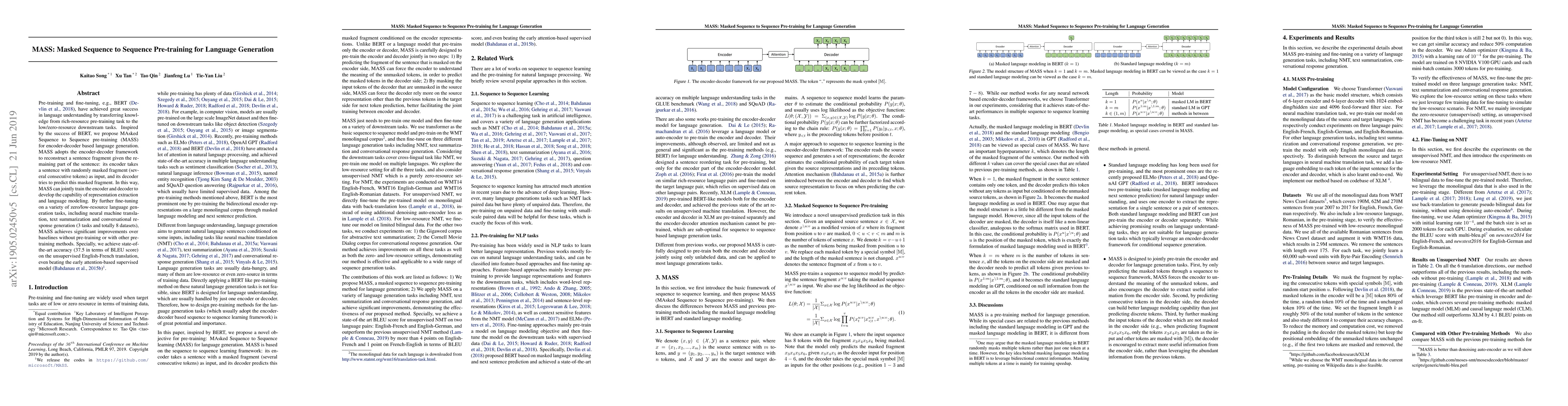 The paper proposes MASS, a Masked Sequence to Sequence pre-training method for encoder-decoder based language generation tasks. MASS improves language modeling and representation extraction through joint training of an encoder and decoder on masked sentence fragments, achieving significant gains on various low/zero-resource language generation tasks, including text summarization and neural machine translation.
