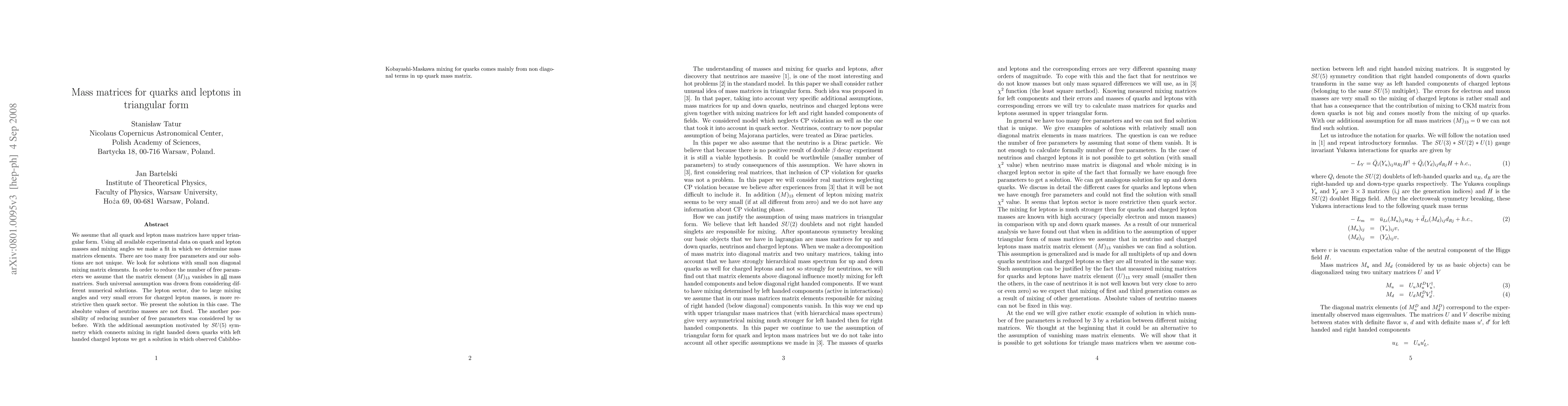We assume that all quark and lepton mass matrices have upper triangular form. Using all available experimental data on quark and lepton masses and mixing angles we make a fit in which we determine mass matrices elements. There are too many free parameters and our solutions are not uniqe. We look for solutions with small non diagonal mixing matrix elements. In order to reduce the number of free parameters we assume that the matrix element $(M)_{13}$ vanishes in \underline{all} mass matrices. Such universal assumption was drown from considering different numerical solutions. The lepton sector, due to large mixing angles and very small errors for charged lepton masses, is more restrictive then quark sector. We present the solution in this case. The absolute values of neutrino masses are not fixed. The another possibility of reducing number of free parameters was considered by us before. With the additional assumption motivated by SU(5) symmetry which connects mixing in right handed down quarks with left handed charged leptons we get a solution in which observed Cabibbo-Kobayashi-Maskawa mixing for quarks comes mainly from non diagonal terms in up quark mass matrix. From the fit we get also predictions for neutrino masses.