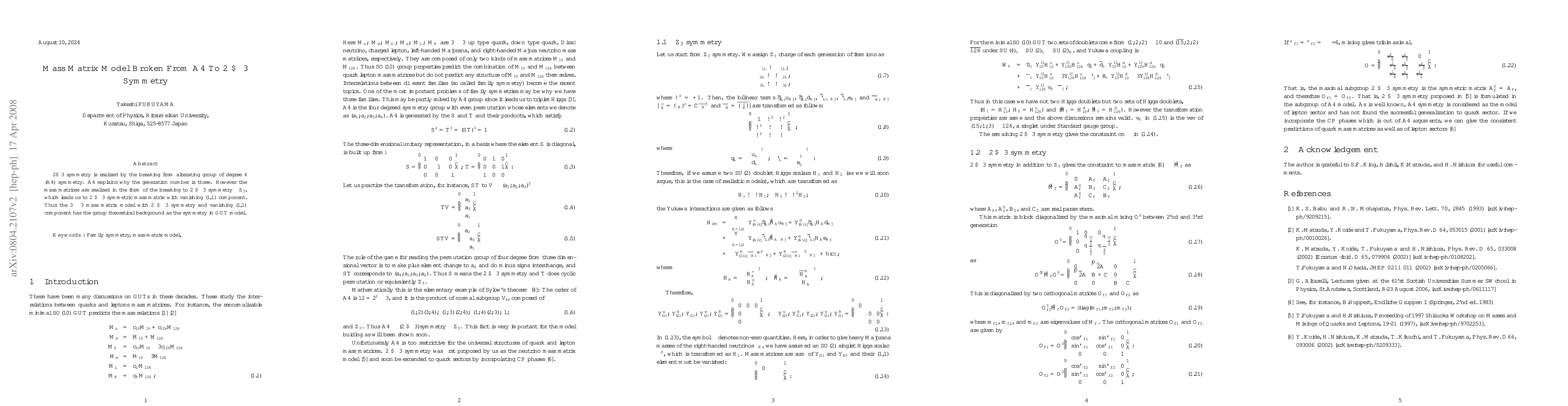 This paper explores the realization of 2$\leftrightarrow$3 symmetry through the breaking of $A_4$ symmetry, explaining the three-generation structure. It constructs a $3\times 3$ mass matrix model with $2\leftrightarrow 3$ symmetry and a vanishing (1,1) component, grounded in the framework of Grand Unified Theory (GUT).