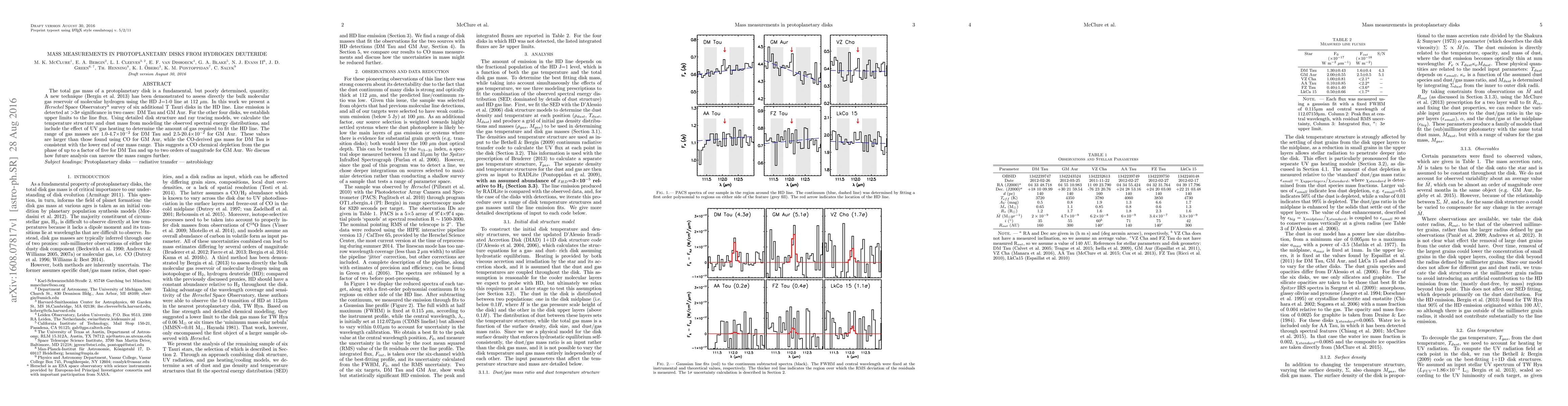 This study employs the HD J=1-0 line at 112 µm to measure the gas mass in six protoplanetary disks using the Herschel Space Observatory. The technique reveals gas masses of 1.0-4.7×10^-2 for DM Tau and 2.5-20.4×10^-2 for GM Aur, suggesting significant CO chemical depletion in these disks.