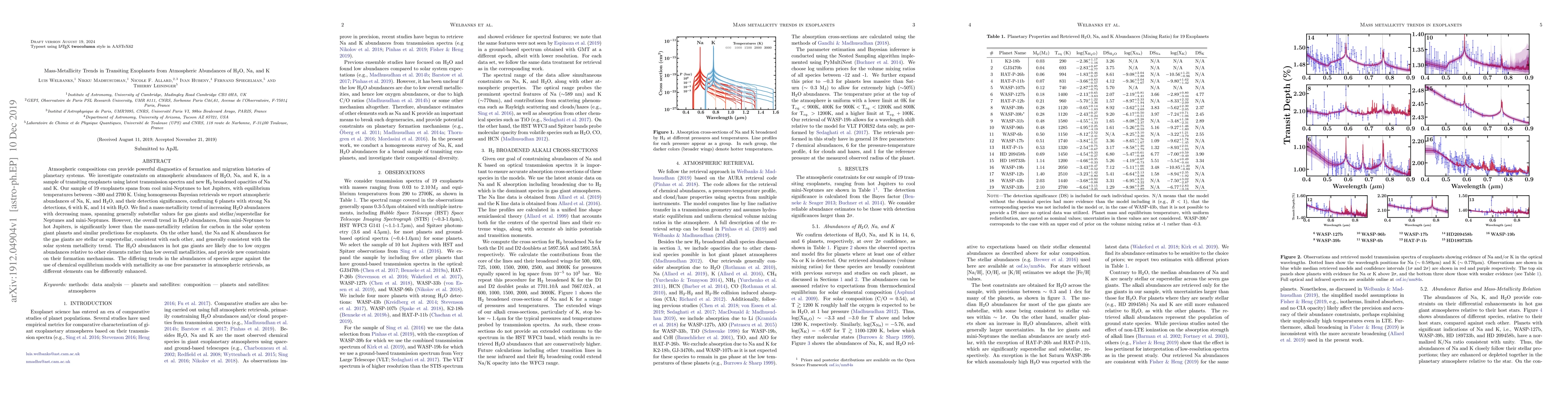 This study investigates atmospheric compositions of 19 transiting exoplanets, revealing a mass-metallicity trend where H$_2$O abundances increase with decreasing mass, contrasting with solar system predictions. Na and K abundances in gas giants align with solar metallicity trends, suggesting different formation mechanisms for H$_2$O.