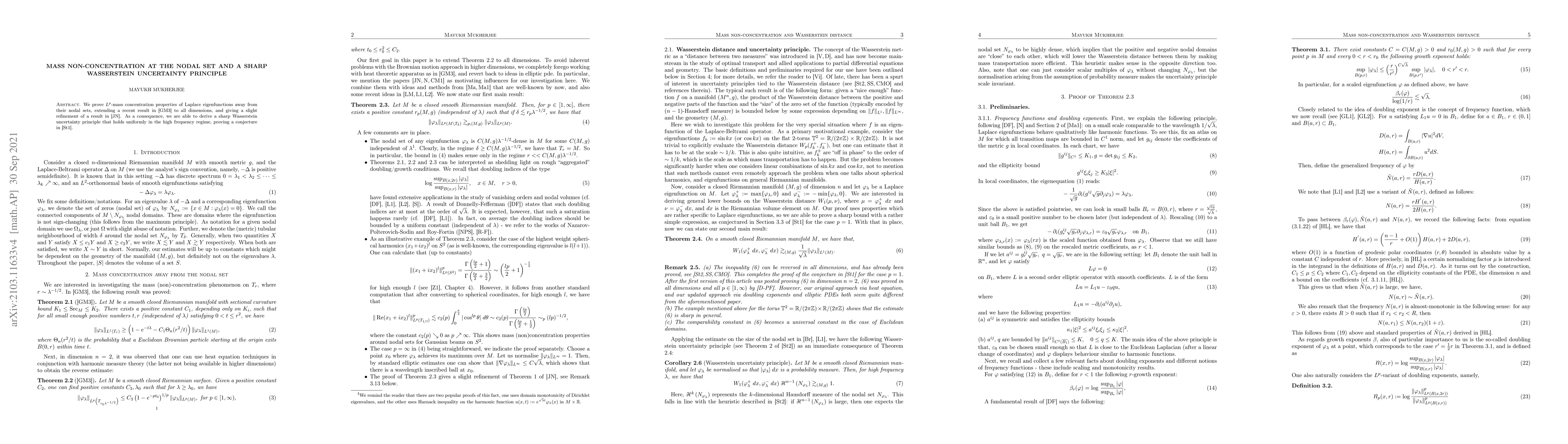 We prove $L^p$-mass concentration properties of Laplace eigenfunctions away from their nodal sets, extending a recent result in \cite{GM3} to all dimensions, and giving a slight refinement of a result in \cite{JN}. As a consequence, we are able to derive a sharp Wasserstein uncertainty principle that holds uniformly in the high frequency regime, proving a conjecture in \cite{St1}.
