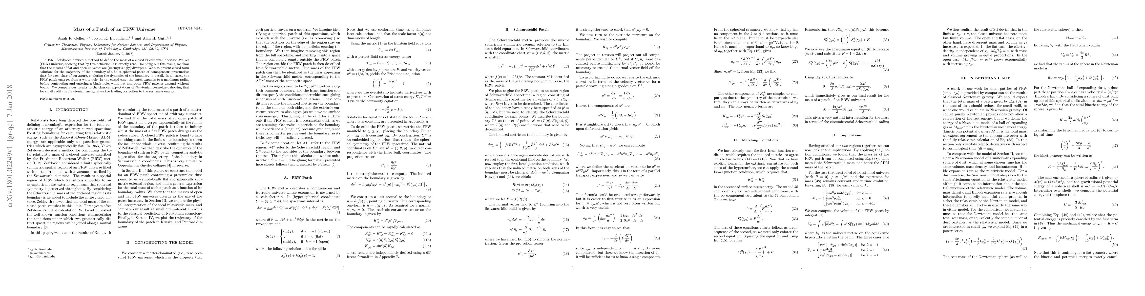 The research extends Zel'dovich's original work by providing a general expression for the mass of FRW patches, confirming his result for closed universes, and comparing relativistic and Newtonian energies for small patches, offering new insights into cosmic mass distributions.