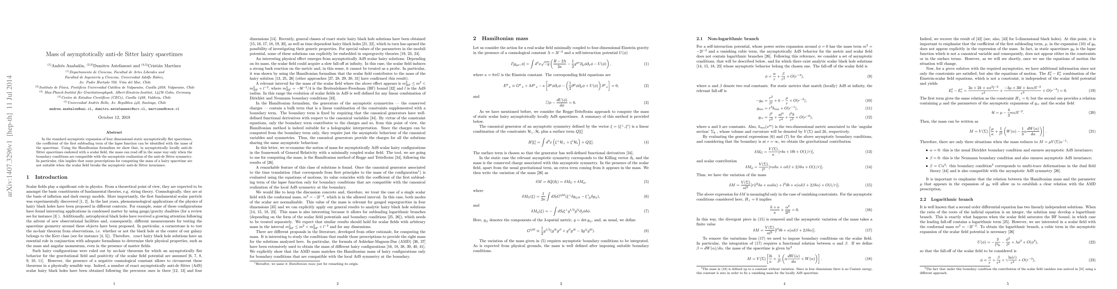 In the standard asymptotic expansion of four dimensional static asymptotically flat spacetimes, the coefficient of the first subleading term of the lapse function can be identified with the mass of the spacetime. Using the Hamiltonian formalism we show that, in asymptotically locally anti-de Sitter spacetimes endowed with a scalar field, the mass can read off in the same way only when the boundary conditions are compatible with the asymptotic realization of the anti-de Sitter symmetry. In particular, this implies that some prescriptions for computing the mass of a hairy spacetime are not suitable when the scalar field breaks the asymptotic anti-de Sitter invariance.