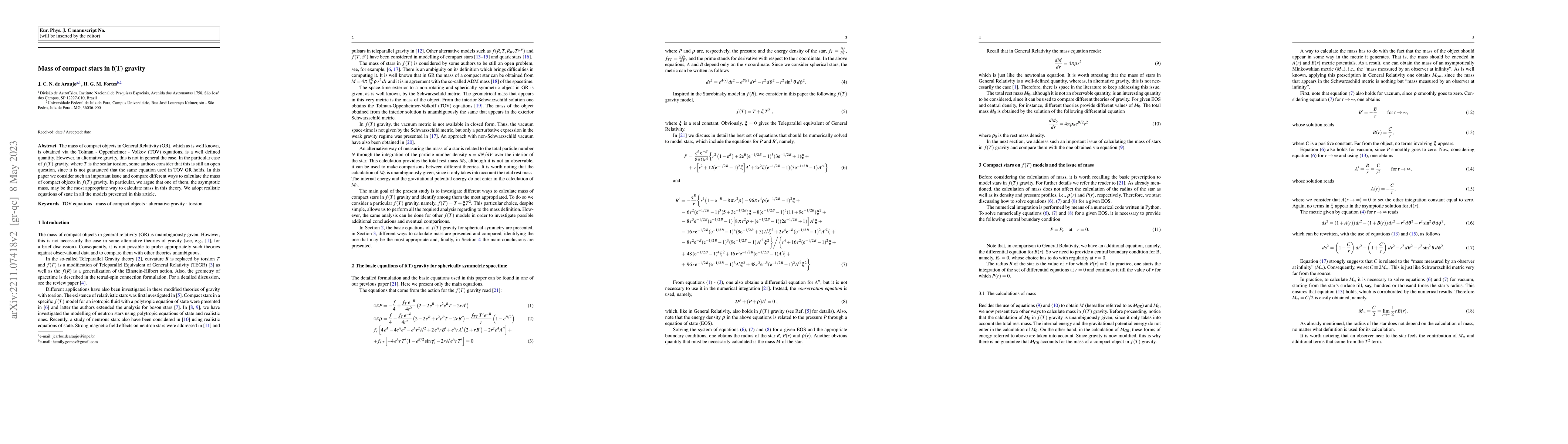 The mass of compact objects in General Relativity (GR), which as is well known, is obtained via the Tolman - Oppenheimer - Volkov (TOV) equations, is a well defined quantity. However, in alternative gravity, this is not in general the case. In the particular case of $f(T)$ gravity, where $T$ is the scalar torsion, some authors consider that this is still an open question, since it is not guaranteed that the same equation used in TOV GR holds. In this paper we consider such an important issue and compare different ways to calculate the mass of compact objects in $f(T)$ gravity. In particular, we argue that one of them, the asymptotic mass, may be the most appropriate way to calculate mass in this theory. We adopt realistic equations of state in all the models presented in this article.