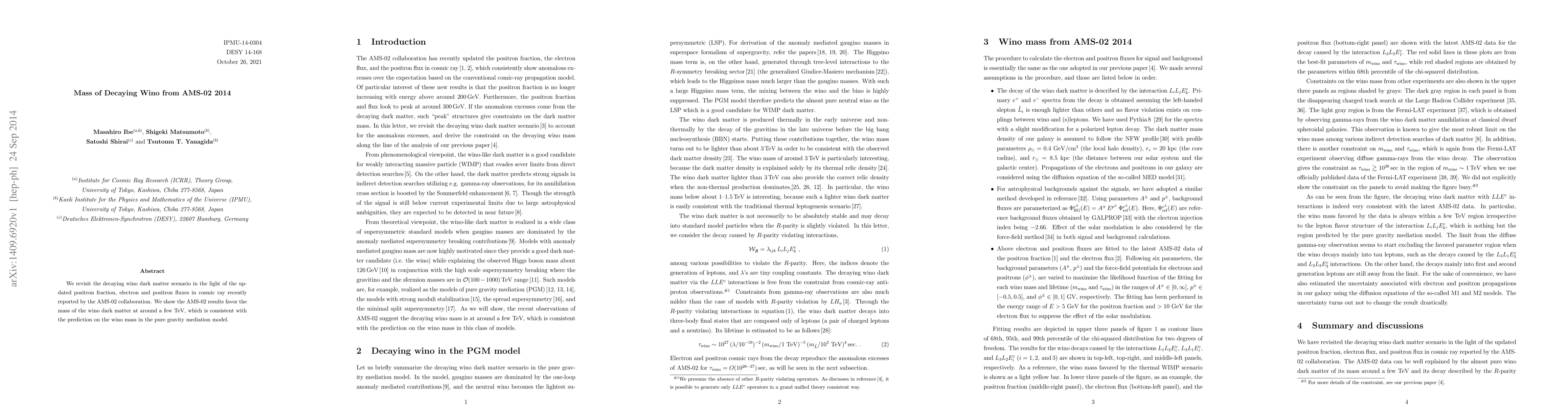 We revisit the decaying wino dark matter scenario in the light of the updated positron fraction, electron and positron fluxes in cosmic ray recently reported by the AMS-02 collaboration. We show the AMS-02 results favor the mass of the wino dark matter at around a few TeV, which is consistent with the prediction on the wino mass in the pure gravity mediation model.