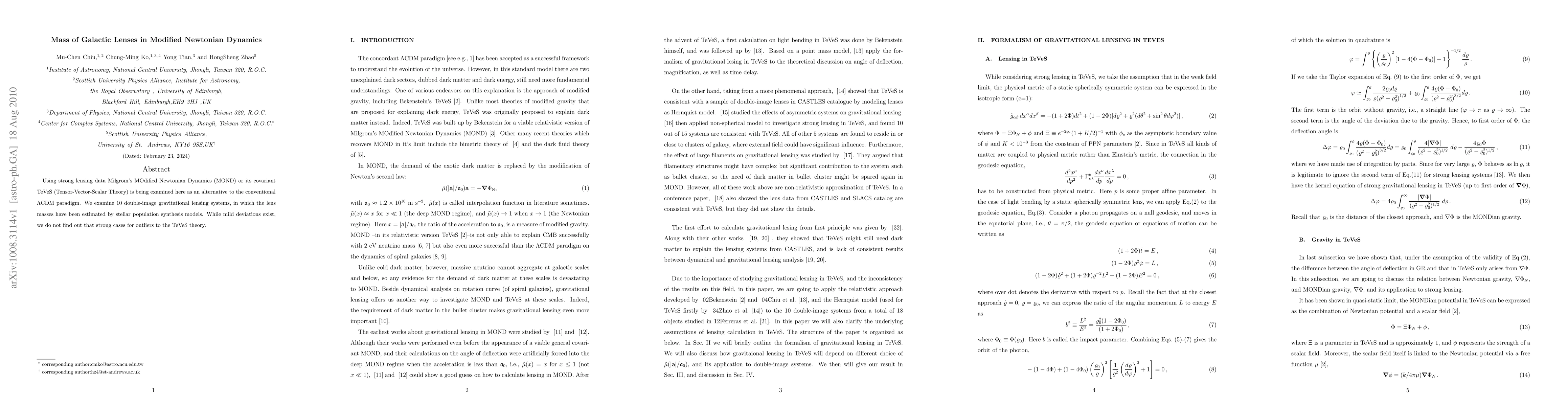 This study investigates the mass of galactic lenses using Milgrom's MOND and its covariant TeVeS theory, as alternatives to the $\Lambda$CDM model, through strong lensing data from 10 double-image systems. Although mild deviations are observed, no strong evidence for outliers to the TeVeS theory is found.