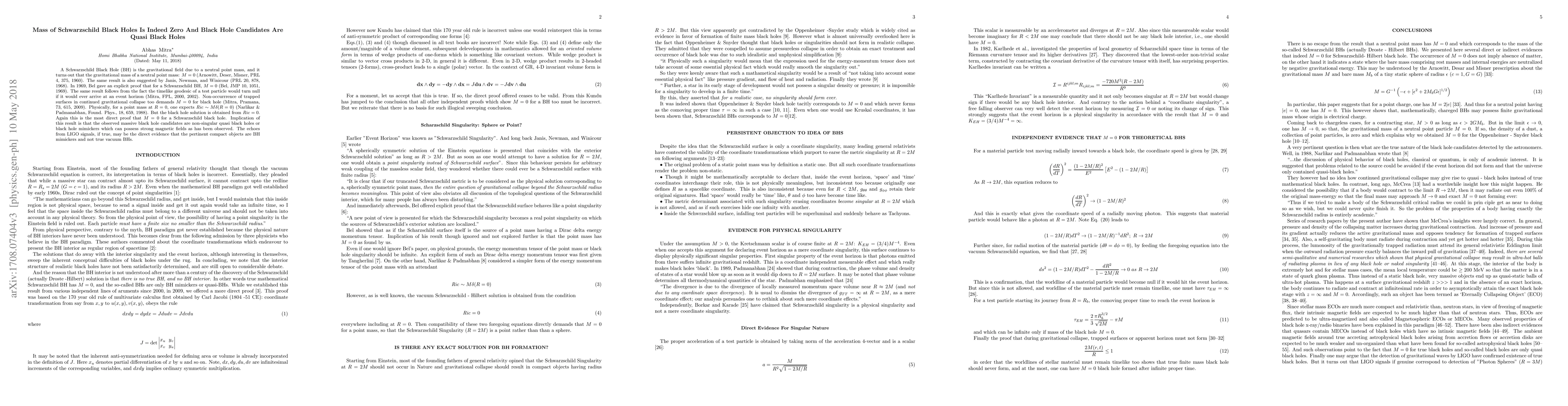 A Schwarzschild Black Hole (BH) is the gravitational field due to a neutral point mass, and it turns out that the gravitational mass of a neutral point mass: $M=0$ (Arnowitt, Deser, Misner, PRL 4, 375, 1960). The same result is also suggested by Janis, Newman, and Winicour (PRL 20, 878, 1968). In 1969, Bel gave an explicit proof that for a Schwarzschild BH, $M=0$ (Bel, JMP 10, 1051, 1969). The same result follows from the fact the timelike geodesic of a test particle would turn null if it would ever arrive at an event horizon (Mitra, FPL, 2000, 2002). Non-occurrrence of trapped surfaces in continued gravitational collapse too demands $M=0$ for black hole (Mitra, Pramana, 73, 615, 2009). Physically, for a point mass at $R=0$, one expects ${\it Ric} \sim M \delta (R=0)$ (Narlikar \& Padmanabhan, Found. Phys., 18, 659, 1988). But the black hole solution is obtained from ${\it Ric} =0$. Again this is the most direct proof that $M=0$ for a Schwarzschild black hole. Implication of this result is that the observed massive black hole candidates are non-singular quasi black holes or black hole mimickers which can possess strong magnetic fields as has been observed. The echoes from LIGO signals, if true, may be the direct evidence that the pertinent compact objects are BH mimickers and not true vacuum BHs.