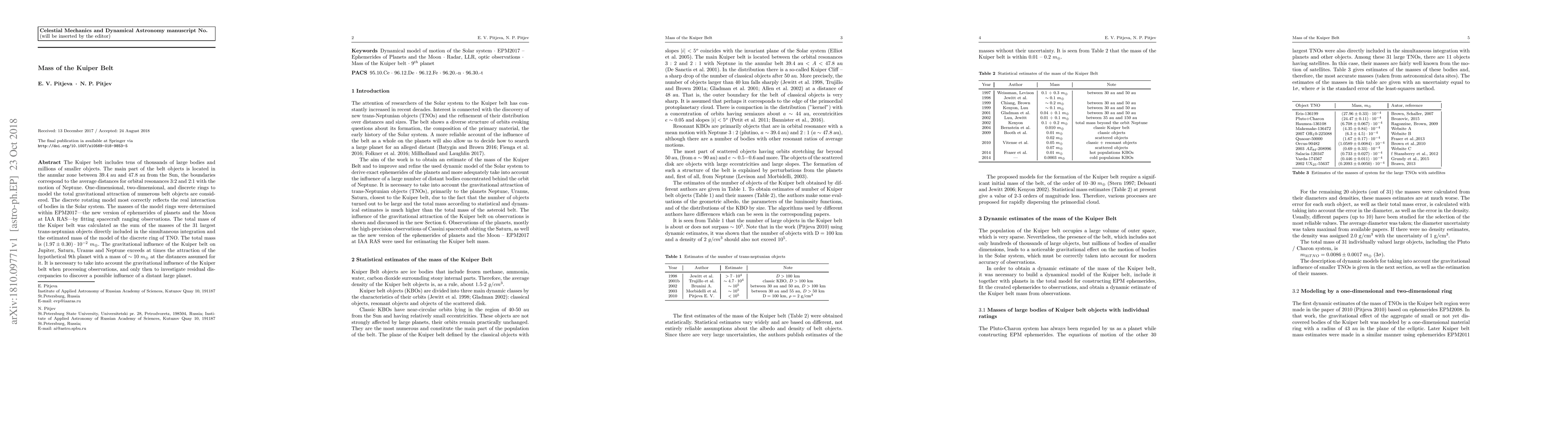 The Kuiper Belt's total mass is estimated to be $(1.97 \pm 0.30)\cdot 10^{-2} \ m_{\oplus}$, calculated from the largest trans-neptunian objects and a discrete ring model. The gravitational influence of the Kuiper Belt on outer planets sometimes exceeds that of a hypothetical 9th planet.