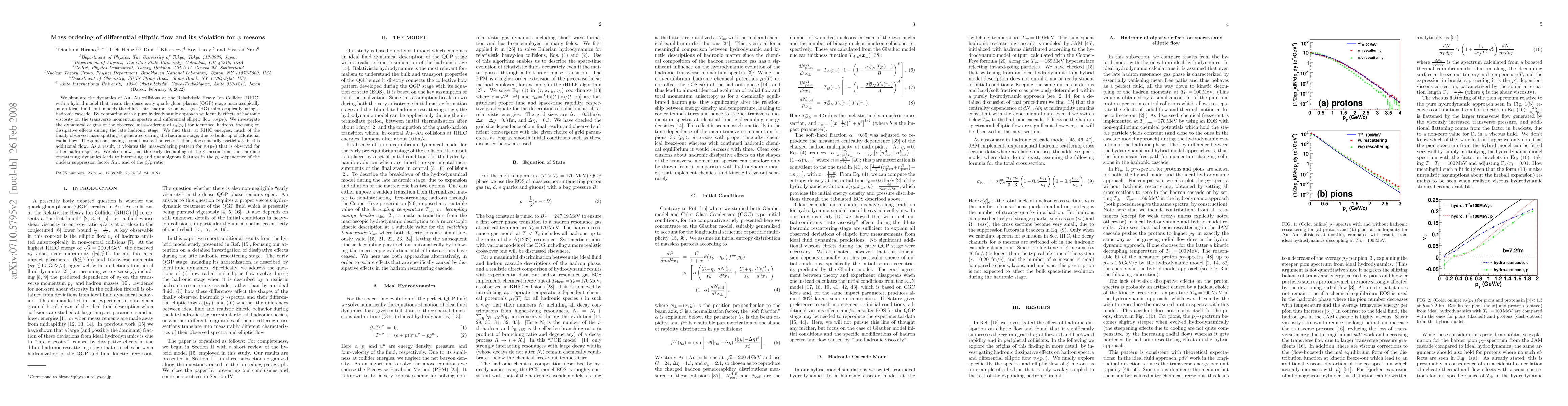 We simulate the dynamics of Au+Au collisions at the Relativistic Heavy Ion Collider (RHIC) with a hybrid model that treats the dense early quark-gluon plasma (QGP) stage macroscopically as an ideal fluid, but models the dilute late hadron resonance gas (HG) microscopically using a hadronic cascade. By comparing with a pure hydrodynamic approach we identify effects of hadronic viscosity on the transverse momentum spectra and differential elliptic flow v_2(p_T). We investigate the dynamical origins of the observed mass-ordering of v_2(p_T) for identified hadrons, focusing on dissipative effects during the late hadronic stage. We find that, at RHIC energies, much of the finally observed mass-splitting is generated during the hadronic stage, due to build-up of additional radial flow. The phi meson, having a small interaction cross section, does not fully participate in this additional flow. As a result, it violates the mass-ordering pattern for v_2(p_T) that is observed for other hadron species. We also show that the early decoupling of the phi meson from the hadronic rescattering dynamics leads to interesting and unambiguous features in the p_T-dependence of the nuclear suppression factor R_AA and of the phi/p ratio.