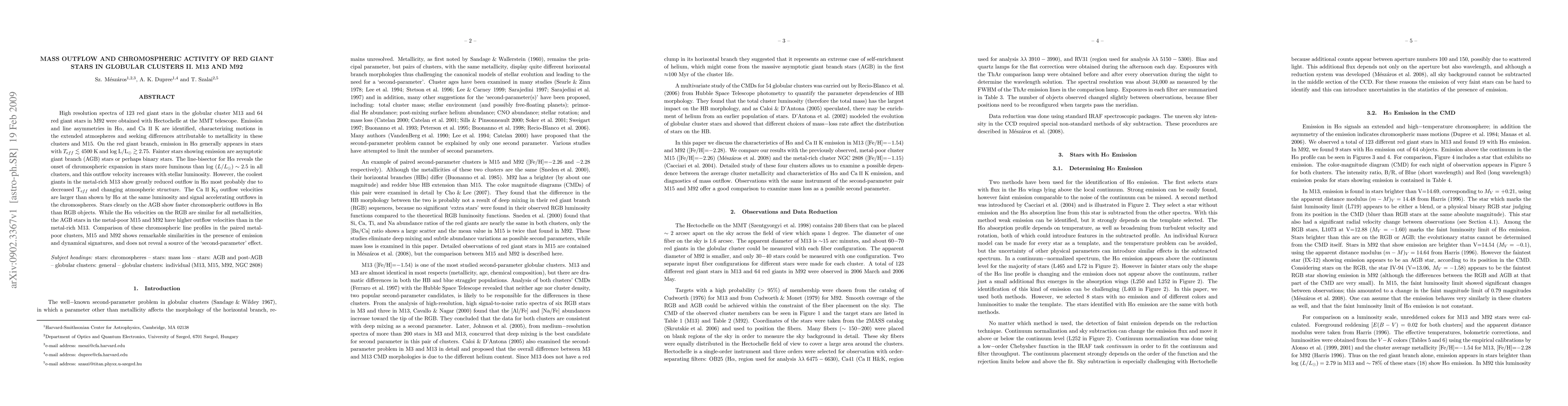 This paper analyzes high-resolution spectra of red giant stars in globular clusters M13 and M92, identifying emission and asymmetries in Halpha and Ca K lines to characterize atmospheric motions and compare chromospheric activity. It finds that Halpha emission and outflow velocities increase with stellar luminosity, but cooler, metal-rich stars show reduced outflow, while AGB stars exhibit faster outflows than RGB stars, with metal-poor clusters showing higher outflow velocities in AGB stars.
