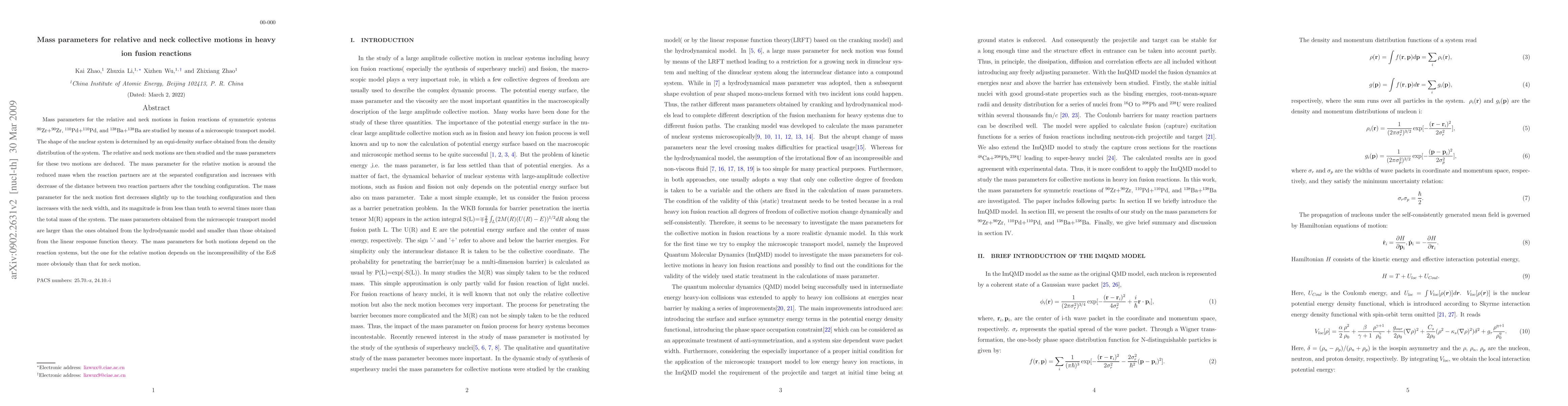 This research investigates mass parameters for relative and neck collective motions in heavy ion fusion reactions using a microscopic transport model. The study finds that mass parameters vary significantly with the distance between reaction partners and the neck width, and differ depending on the reaction system and the nuclear equation of state's incompressibility.