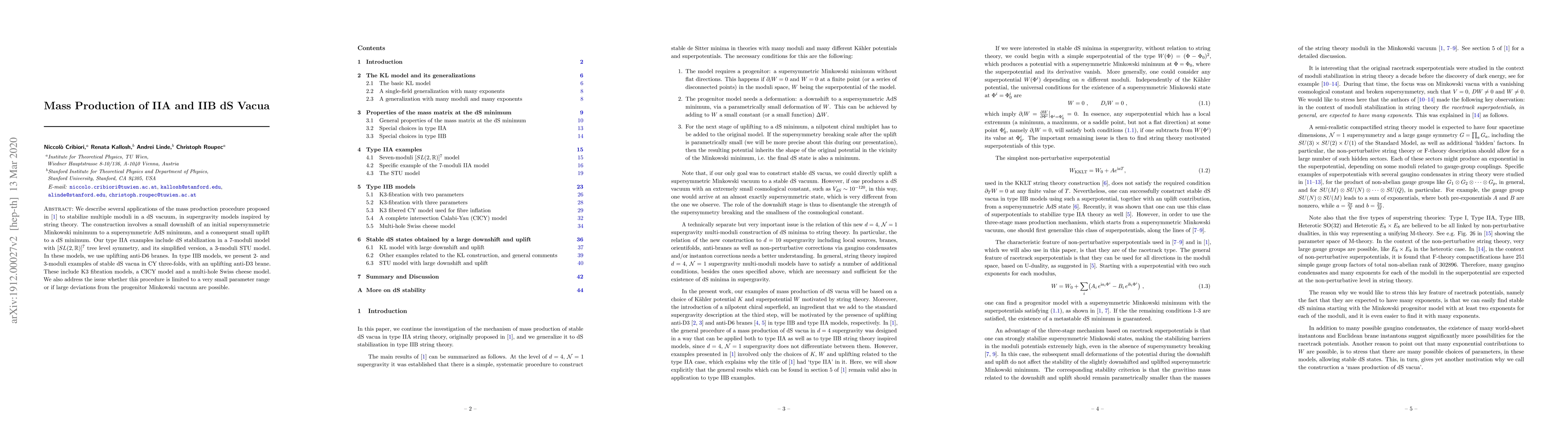 We describe several applications of the recently proposed mass production procedure, where multiple moduli are stabilized in a dS vacuum, in supergravity models inspired by string theory. The construction involves a small downshift of an initial supersymmetric Minkowski minimum to a supersymmetric AdS minimum, and a consequent small uplift to a dS minimum. Our type IIA examples include dS stabilization in a 7-moduli model with $[SL(2, \mathbb{R})]^7$ tree level symmetry, and its simplified version, a 3-moduli STU model. In these models, we use uplifting anti-D6 branes. In type IIB models, we present 2- and 3-moduli examples of stable dS vacua in CY three-folds, with an uplifting anti-D3 brane. These include K3 fibration models, a CICY model and a multi-hole Swiss cheese model. We also address the issue whether this procedure is limited to a very small parameter range or if large deviations from the progenitor Minkowski vacuum are possible.