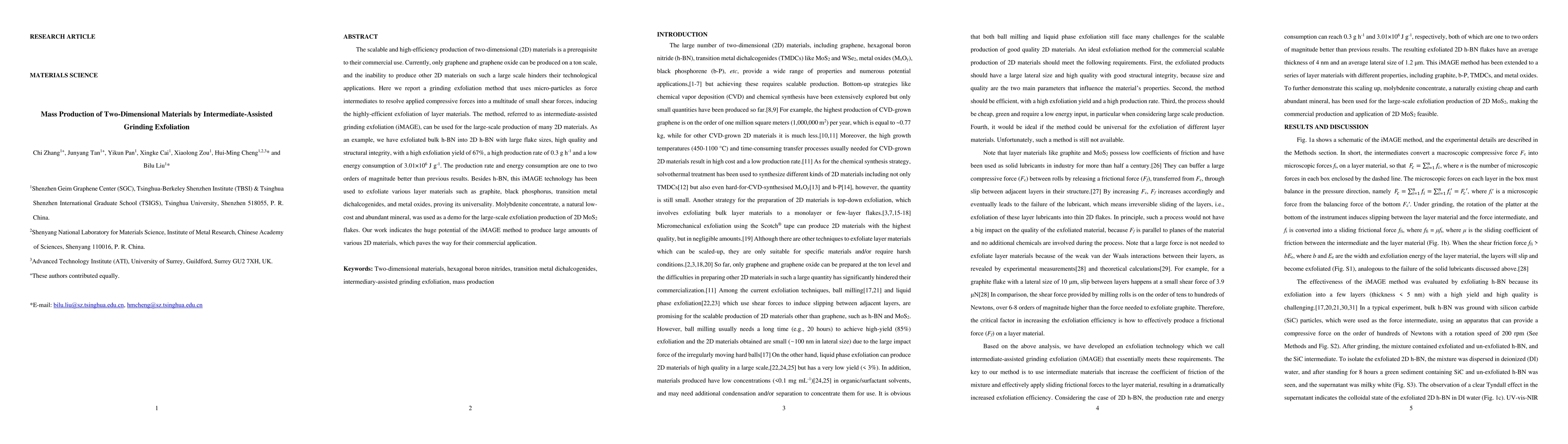 This paper introduces a novel intermediate-assisted grinding exfoliation (iMAGE) method for scalable production of high-quality 2D materials, significantly improving production rates and energy efficiency. The iMAGE method has successfully exfoliated bulk h-BN and other materials like graphite and MoS2, demonstrating its potential for commercial applications.