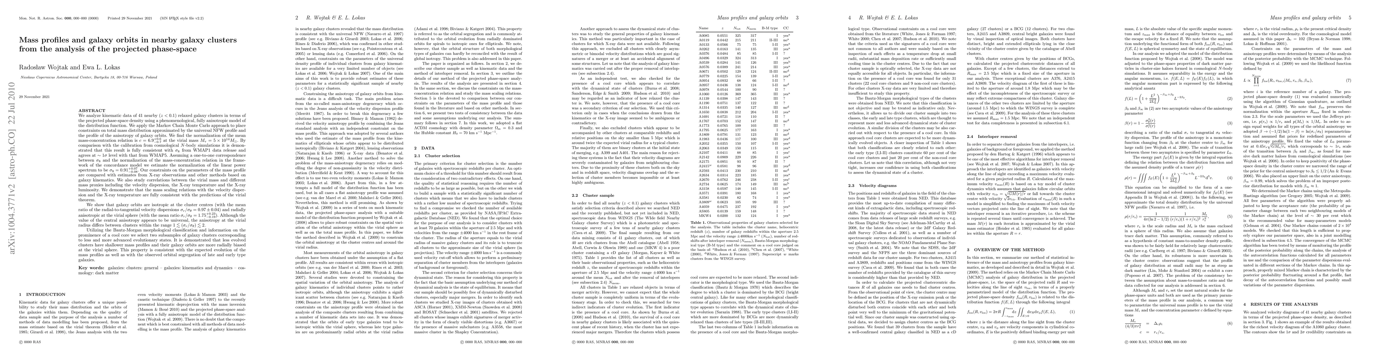 This paper analyzes the mass profiles and galaxy orbits in 41 nearby galaxy clusters using projected phase-space density and finds that galaxy orbits are isotropic at the centers but radially anisotropic at the virial radius. It also shows that less evolved clusters have shallower mass profiles and more radially biased orbits.