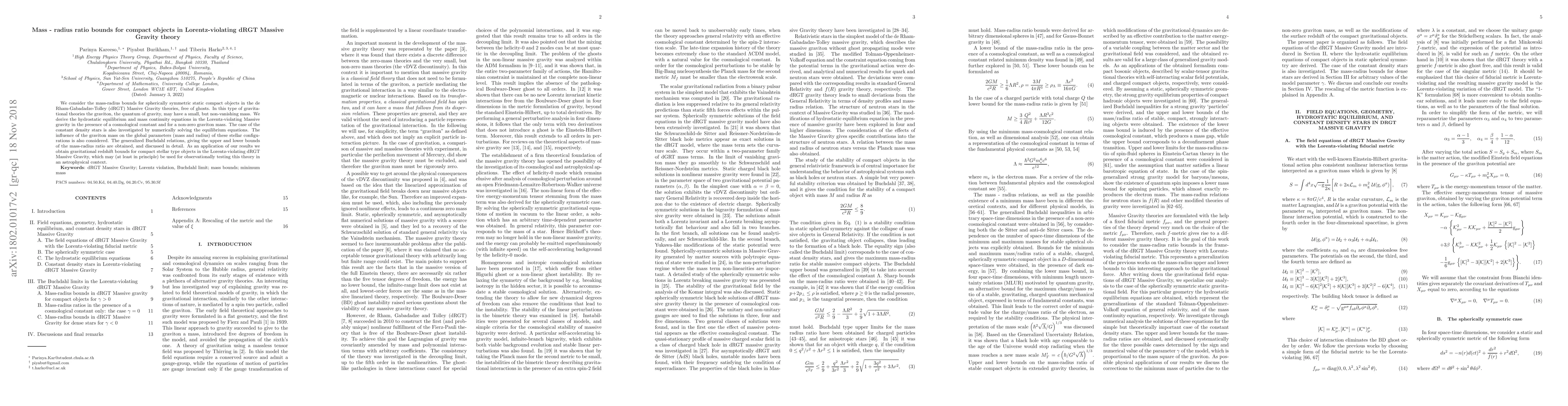 This paper investigates mass-radius bounds for compact objects in the dRGT Massive Gravity theory, deriving hydrostatic equilibrium and mass continuity equations in the presence of Lorentz violation and a cosmological constant. It numerically examines constant density stars and discusses the impact of graviton mass on stellar parameters, obtaining generalized Buchdahl relations and gravitational redshift bounds for potential observational tests.