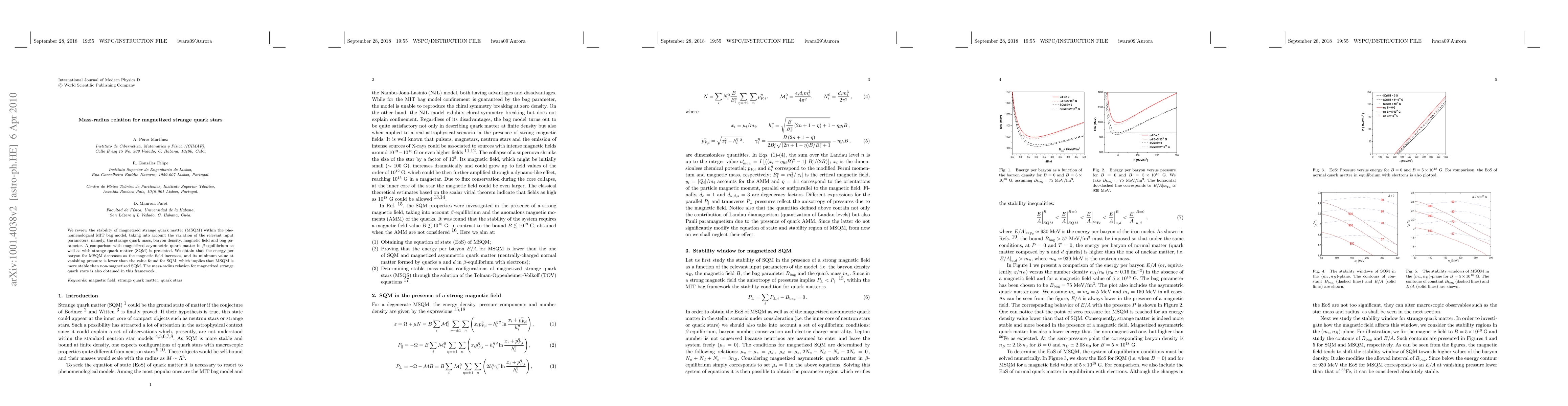 This paper examines the stability of magnetized strange quark matter (MSQM) using the MIT bag model, finding that MSQM is more stable than non-magnetized strange quark matter (SQM). The mass-radius relation for magnetized strange quark stars is derived, showing that increased magnetic fields lower the energy per baryon.