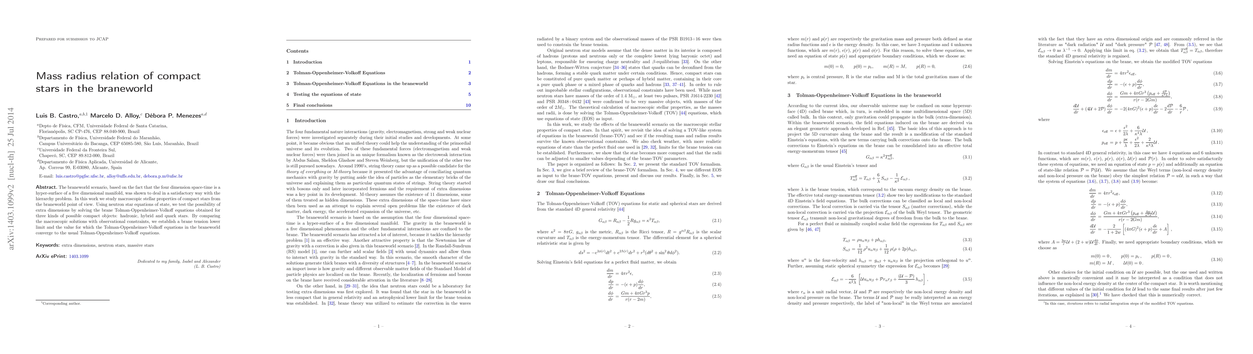 This paper investigates the mass-radius relation of compact stars within the braneworld framework, solving the brane Tolman-Oppenheimer-Volkoff equations for hadronic, hybrid, and quark stars to test for extra dimensions. It establishes a lower limit for brane tension and confirms the convergence of braneworld equations with standard models under observational constraints.