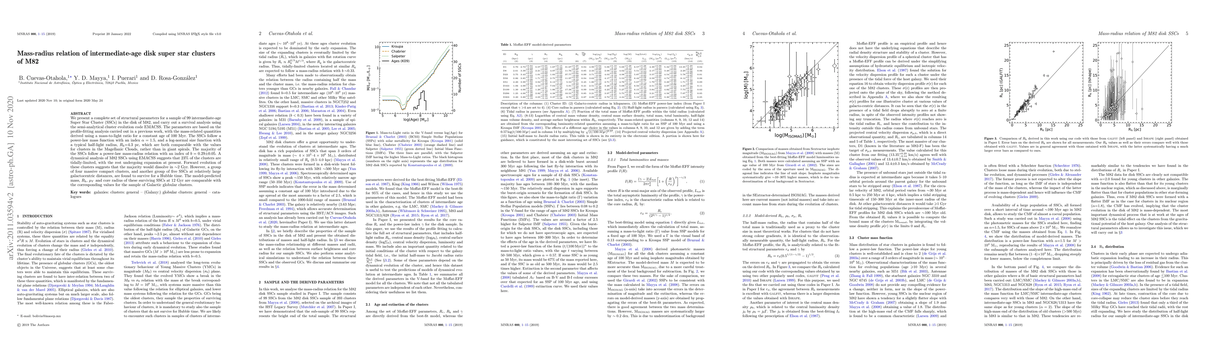 This study analyzes 99 intermediate-age Super Star Clusters (SSCs) in M82's disk, finding they follow a power-law mass-radius relation with an index of b=0.29±0.05. Most clusters are expected to dissolve in ~2 Gyr, but a group of massive, compact clusters and a group of five SSCs at large distances are predicted to survive for a Hubble time, resembling Galactic globular clusters.