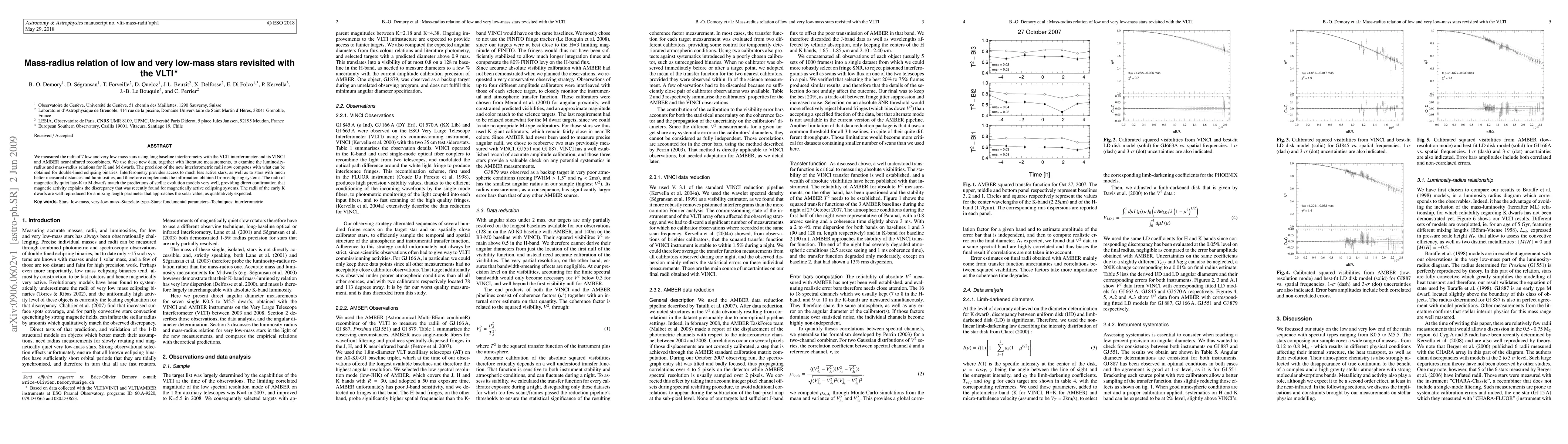 We measured the radii of 7 low and very low-mass stars using long baseline interferometry with the VLTI interferometer and its VINCI and AMBER near-infrared recombiners. We use these new data, together with literature measurements, to examine the luminosity- radius and mass-radius relations for K and M dwarfs. The precision of the new interferometric radii now competes with what can be obtained for double-lined eclipsing binaries. Interferometry provides access to much less active stars, as well as to stars with much better measured distances and luminosities, and therefore complements the information obtained from eclipsing systems. The radii of magnetically quiet late-K to M dwarfs match the predictions of stellar evolution models very well, providing direct confirmation that magnetic activity explains the discrepancy that was recently found for magnetically active eclipsing systems. The radii of the early K dwarfs are well reproduced for a mixing length parameter that approaches the solar value, as qualitatively expected.