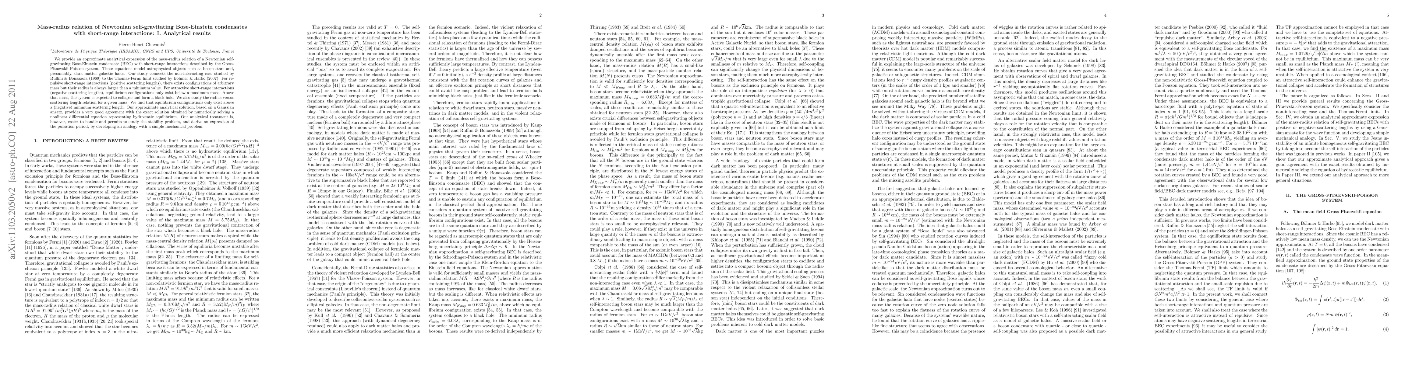 This paper derives an approximate analytical expression for the mass-radius relation of Newtonian self-gravitating Bose-Einstein condensates with short-range interactions, showing that repulsive interactions allow for configurations of arbitrary mass while attractive interactions lead to collapse above a maximum mass. The analytical solution aligns well with numerical results and facilitates stability analysis.