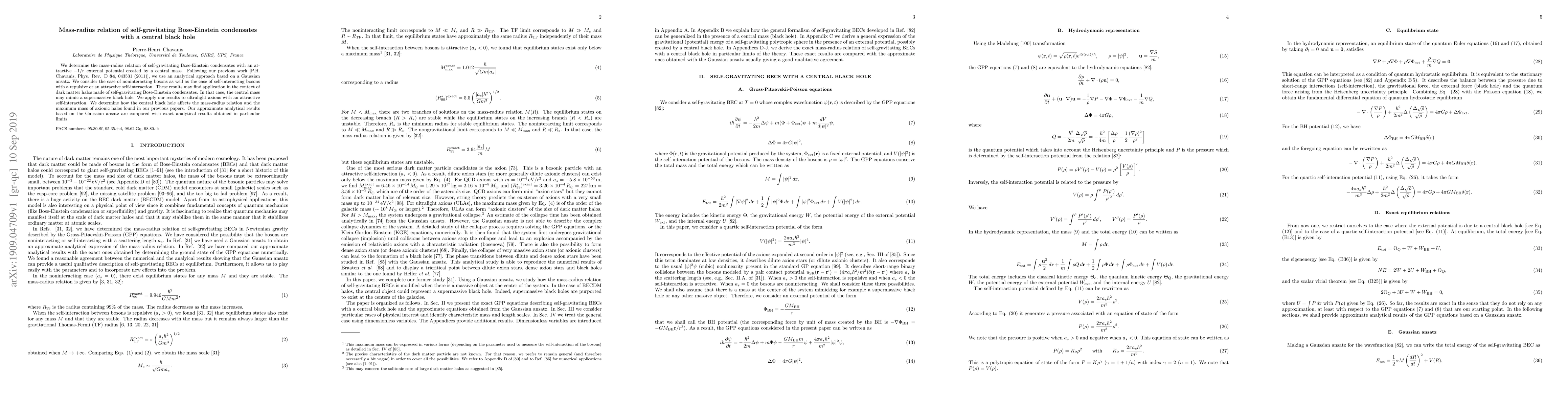 This paper investigates the mass-radius relation of self-gravitating Bose-Einstein condensates influenced by a central black hole, using an analytical Gaussian ansatz approach. It examines both noninteracting and self-interacting bosons, and finds implications for dark matter halos and ultralight axions.