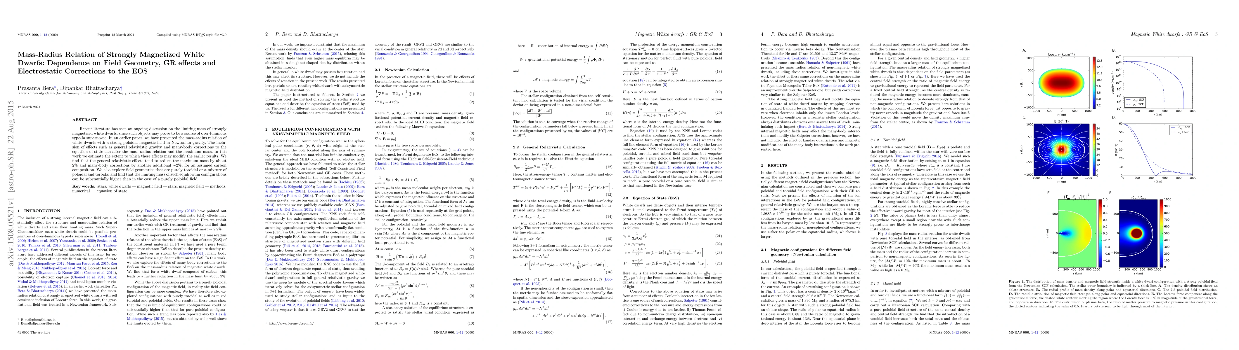 This paper investigates the mass-radius relation for strongly magnetized white dwarfs, considering general relativistic effects and many-body corrections to the equation of state. It finds that general relativity reduces the maximum mass by about 2%, and many-body corrections reduce it by an additional 2%, while mixed field geometries can support higher limiting masses than purely poloidal fields.