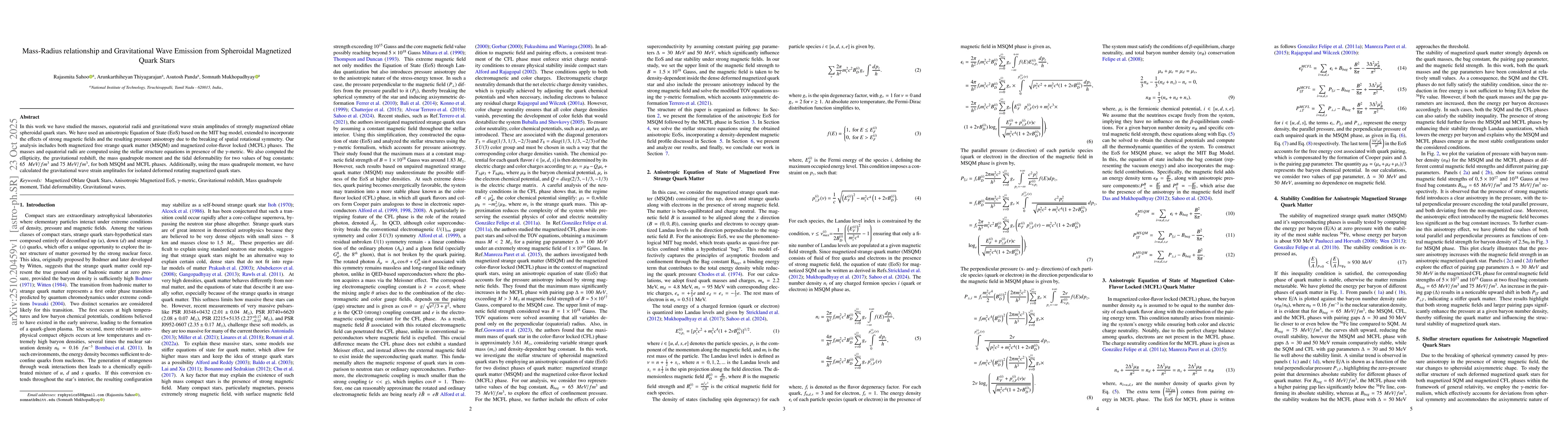 Development of a comprehensive framework for analyzing magnetized quark stars, including tidal deformability calculations and gravitational wave emission characteristics under extreme magnetic fields.