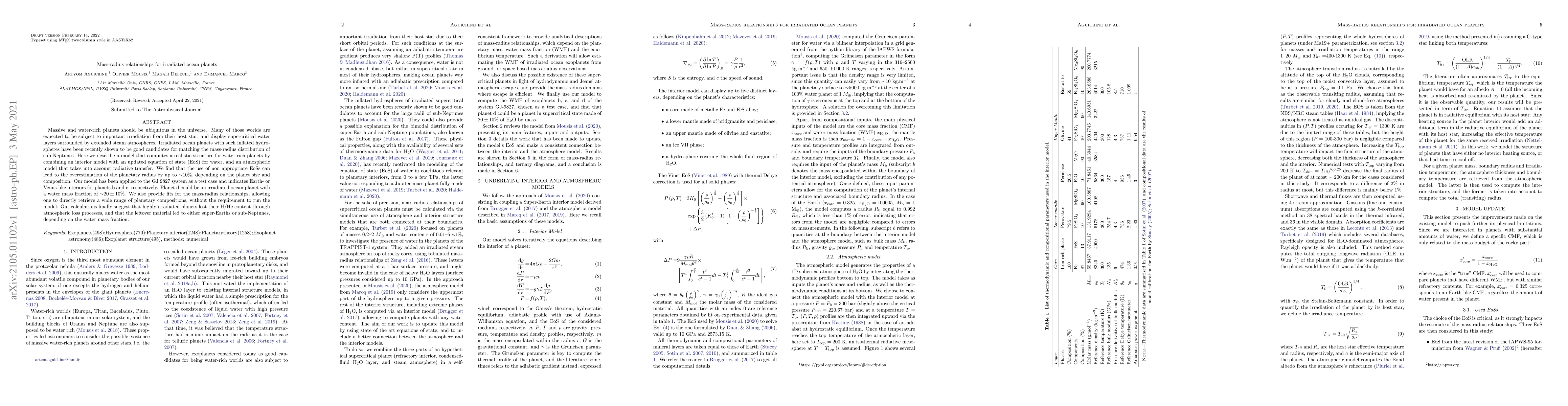 This paper develops a model to compute the realistic structure of irradiated ocean planets, combining an interior model with an updated equation of state for water and an atmospheric model considering radiative transfer. It finds that inappropriate equations of state can overestimate planetary radius by up to 10%, and suggests that highly irradiated planets may lose H/He content, leading to super-Earths or sub-Neptunes depending on water mass fraction.