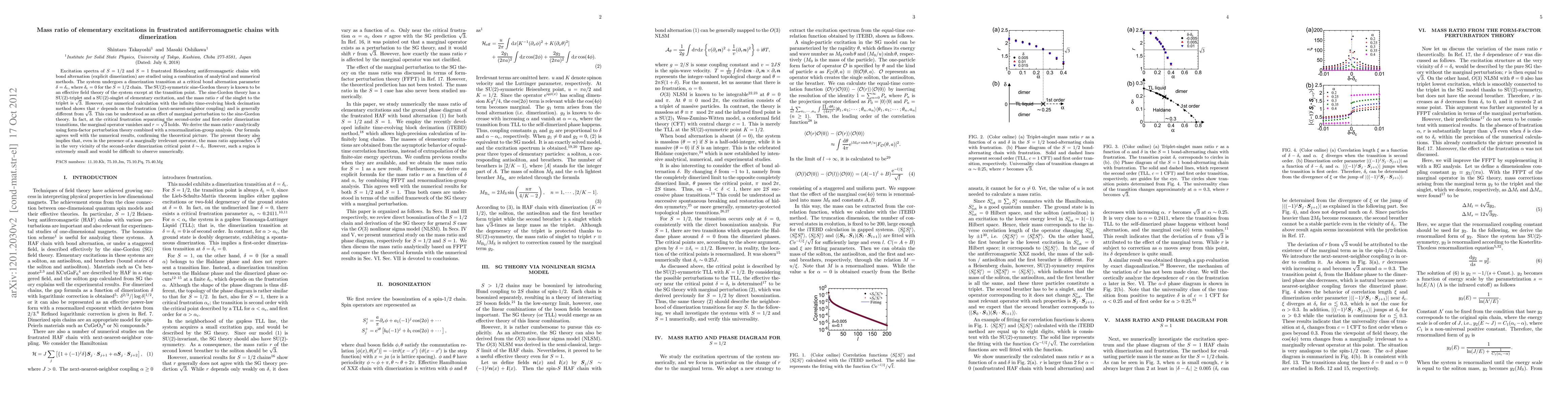 Excitation spectra of S=1/2 and S=1 frustrated Heisenberg antiferromagnetic chains with bond alternation (explicit dimerization) are studied using a combination of analytical and numerical methods. The system undergoes a dimerization transition at a critical bond alternation parameter $\delta=\delta_{\rm c}$, where $\delta_{\rm c} = 0$ for the S=1/2 chain. The SU(2)-symmetric sine-Gordon theory is known to be an effective field theory of the system except at the transition point. The sine-Gordon theory has a SU(2)-triplet and a SU(2)-singlet of elementary excitation, and the mass ratio $r$ of the singlet to the triplet is $\sqrt{3}$. However, our numerical calculation with the infinite time-evolving block decimation method shows that $r$ depends on the frustration (next-nearest-neighbor coupling) and is generally different from $\sqrt{3}$. This can be understood as an effect of marginal perturbation to the sine-Gordon theory. In fact, at the critical frustration separating the second-order and first-order dimerization transitions, the marginal operator vanishes and $r=\sqrt{3}$ holds. We derive the mass ratio $r$ analytically using form-factor perturbation theory combined with a renormalization-group analysis. Our formula agrees well with the numerical results, confirming the theoretical picture. The present theory also implies that, even in the presence of a marginally irrelevant operator, the mass ratio approaches $\sqrt{3}$ in the very vicinity of the second-order dimerization critical point $\delta \sim \delta_c$. However, such a region is extremely small and would be difficult to observe numerically.