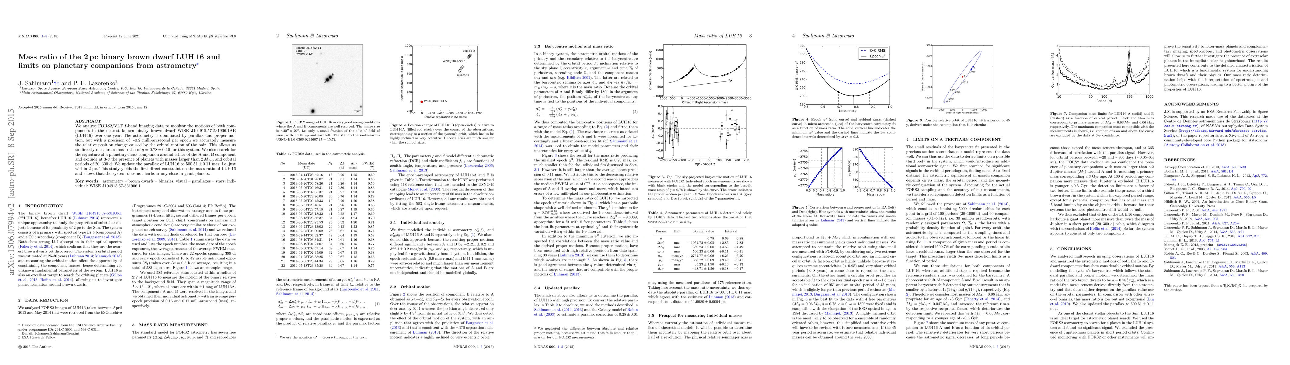 This study uses astrometry to measure the mass ratio of the binary brown dwarf LUH16 to be $q=0.78\pm0.10$, and finds no evidence of giant planets within 20-300 days of either component. The updated parallax places LUH16 at just 2 pc from Earth.
