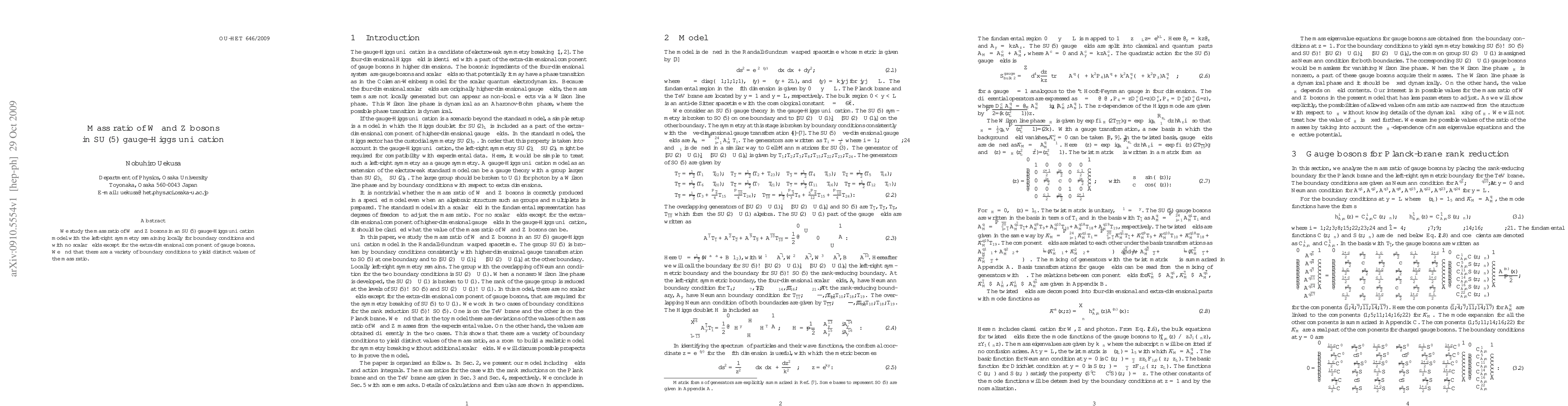 This paper investigates the mass ratio of W and Z bosons within an SU(5) gauge-Higgs unification framework, revealing that different boundary conditions can produce distinct mass ratios without the need for additional scalar fields. Various boundary conditions yield diverse values for the W and Z boson mass ratio.