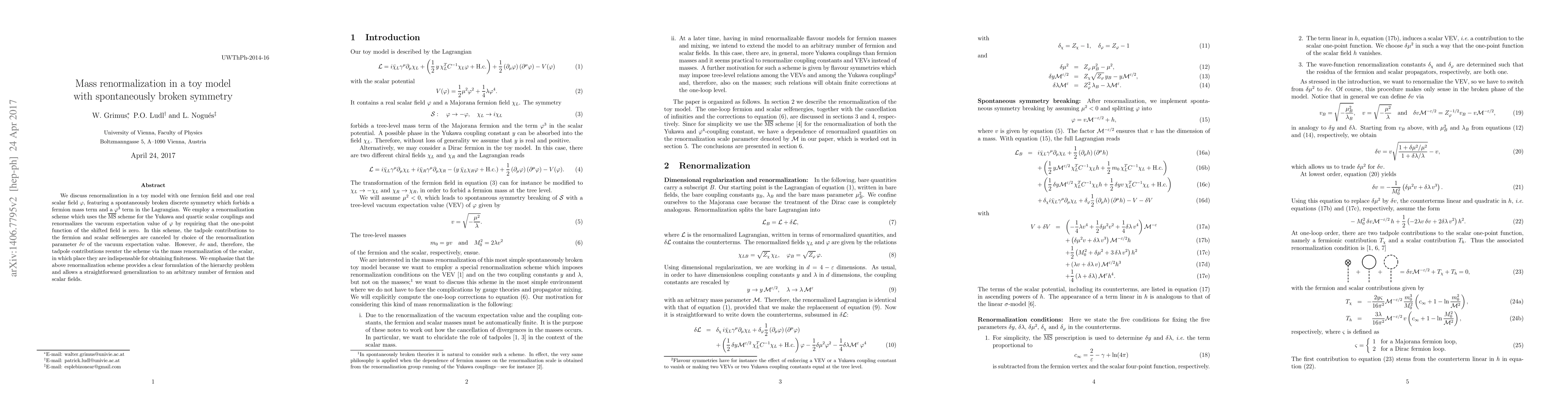 We discuss renormalization in a toy model with one fermion field and one real scalar field phi, featuring a spontaneously broken discrete symmetry which forbids a fermion mass term and a phi^3 term in the Lagrangian. We employ a renormalization scheme which uses the MSbar scheme for the Yukawa and quartic scalar couplings and renormalizes the vacuum expectation value of phi by requiring that the one-point function of the shifted field is zero. In this scheme, the tadpole contributions to the fermion and scalar selfenergies are canceled by choice of the renormalization parameter delta_v of the vacuum expectation value. However, delta_v and, therefore, the tadpole contributions reenter the scheme via the mass renormalization of the scalar, in which place they are indispensable for obtaining finiteness. We emphasize that the above renormalization scheme provides a clear formulation of the hierarchy problem and allows a straightforward generalization to an arbitrary number of fermion and scalar fields.