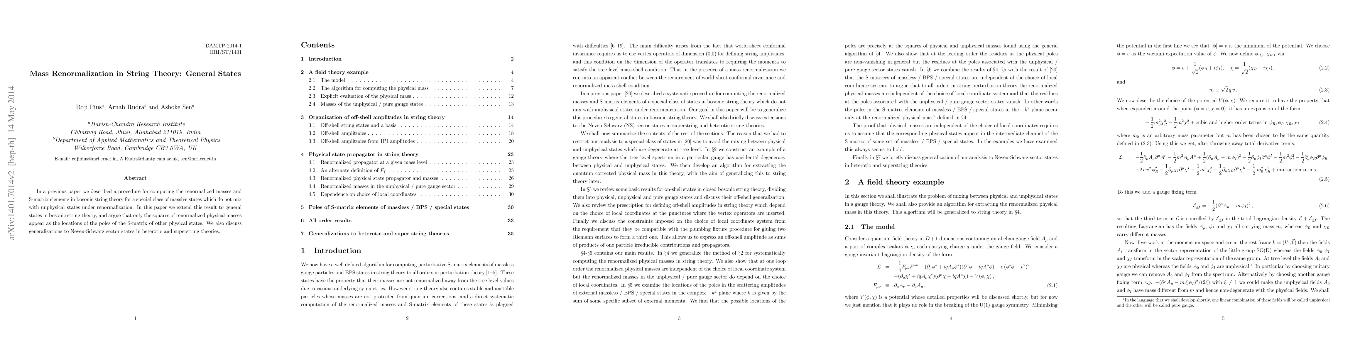 In a previous paper we described a procedure for computing the renormalized masses and S-matrix elements in bosonic string theory for a special class of massive states which do not mix with unphysical states under renormalization. In this paper we extend this result to general states in bosonic string theory, and argue that only the squares of renormalized physical masses appear as the locations of the poles of the S-matrix of other physical states. We also discuss generalizations to Neveu-Schwarz sector states in heterotic and superstring theories.