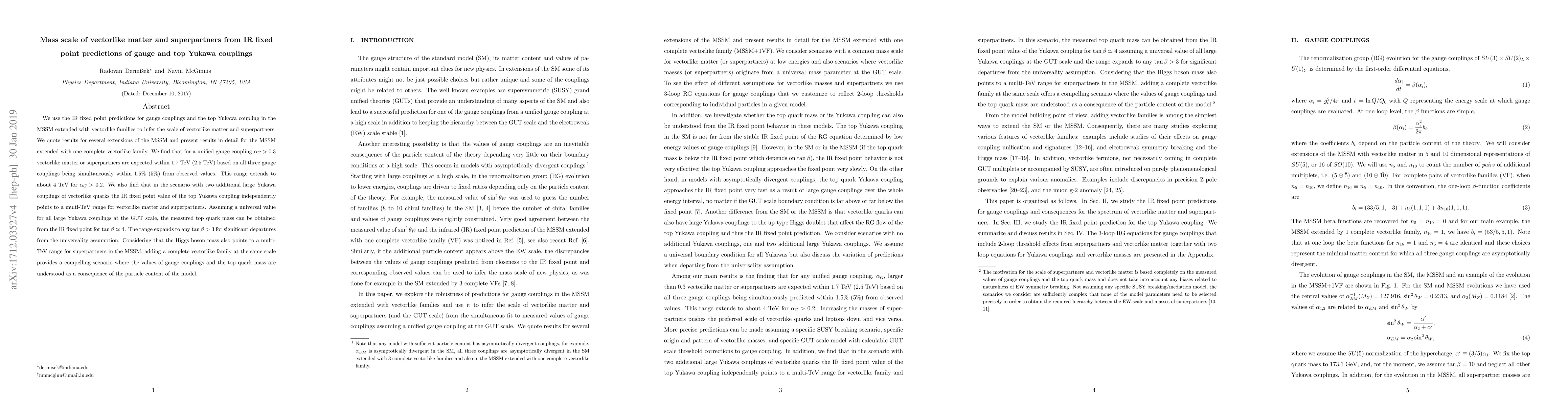 We use the IR fixed point predictions for gauge couplings and the top Yukawa coupling in the MSSM extended with vectorlike families to infer the scale of vectorlike matter and superpartners. We quote results for several extensions of the MSSM and present results in detail for the MSSM extended with one complete vectorlike family. We find that for a unified gauge coupling $\alpha_G > 0.3$ vectorlike matter or superpartners are expected within 1.7 TeV (2.5 TeV) based on all three gauge couplings being simultaneously within 1.5\% (5\%) from observed values. This range extends to about 4 TeV for $\alpha_G > 0.2$. We also find that in the scenario with two additional large Yukawa couplings of vectorlike quarks the IR fixed point value of the top Yukawa coupling independently points to a multi-TeV range for vectorlike matter and superpartners. Assuming a universal value for all large Yukawa couplings at the GUT scale, the measured top quark mass can be obtained from the IR fixed point for $\tan \beta \simeq 4$. The range expands to any $\tan \beta > 3$ for significant departures from the universality assumption. Considering that the Higgs boson mass also points to a multi-TeV range for superpartners in the MSSM, adding a complete vectorlike family at the same scale provides a compelling scenario where the values of gauge couplings and the top quark mass are understood as a consequence of the particle content of the model.