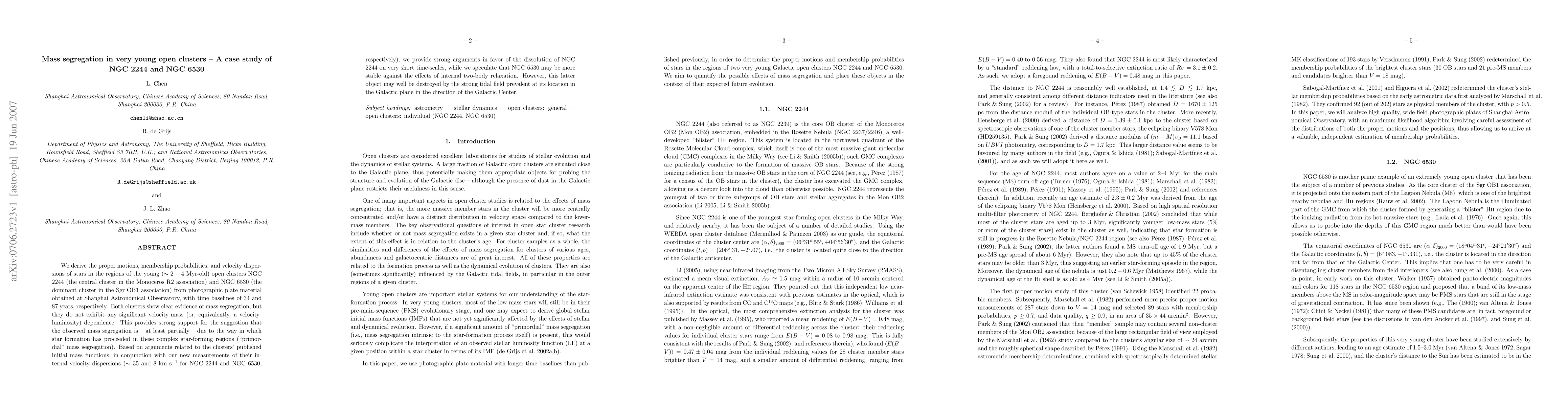 This paper investigates the mass segregation in the young open clusters NGC 2244 and NGC 6530, finding clear evidence of mass segregation without significant velocity-mass dependence, supporting the idea of "primordial" mass segregation. It predicts the dissolution of NGC 2244 due to internal relaxation, while speculating NGC 6530's stability may be compromised by strong tidal forces.