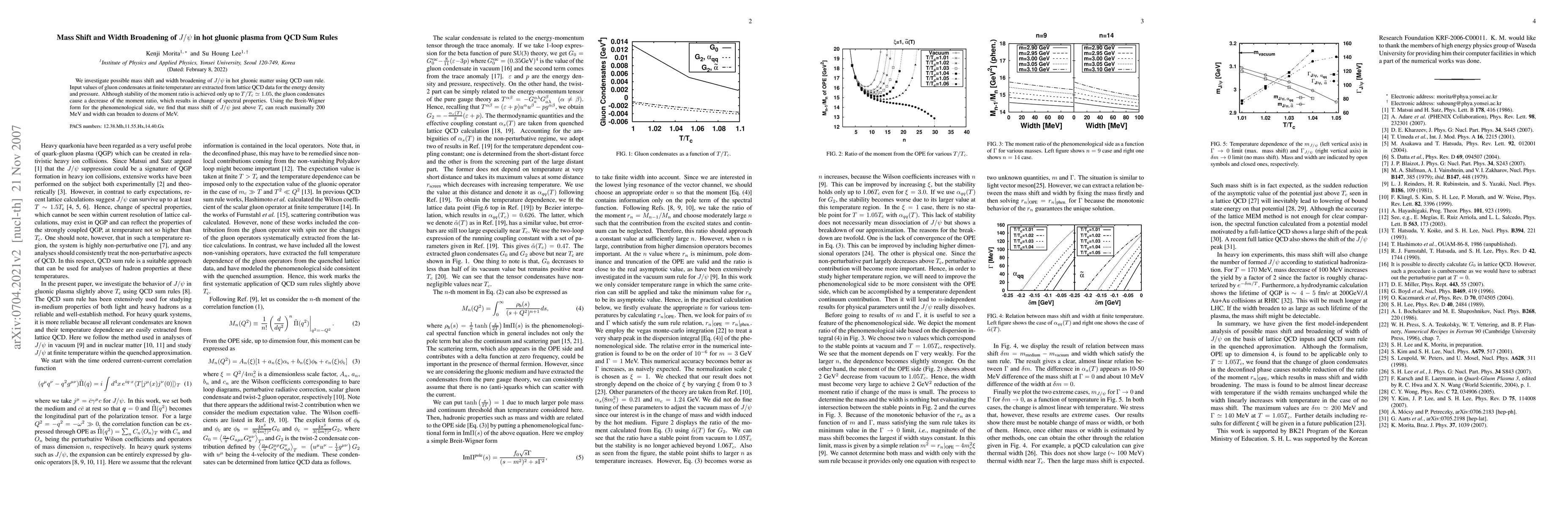 We investigate possible mass shift and width broadening of J/psi in hot gluonic matter using QCD sum rule. Input values of gluon condensates at finite temperature are extracted from lattice QCD data for the energy density and pressure. Although stability of the moment ratio is achieved only up to T/Tc ~ 1.05, the gluon condensates cause a decrease of the moment ratio, which results in change of spectral properties. Using the Breit-Wigner form for the phenomenological side, we find that mass shift of J/psi just above Tc can reach maximally 200 MeV and width can broaden to dozens of MeV.