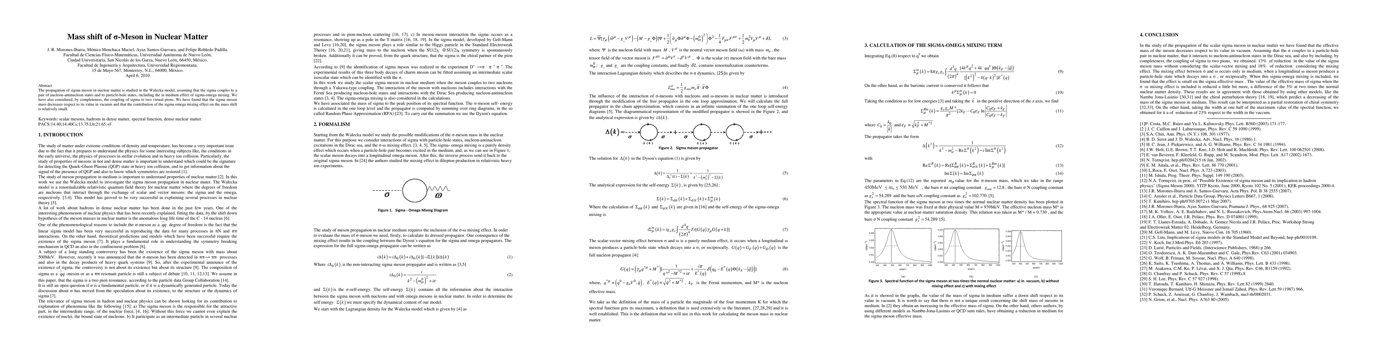 Summary: This study investigates the mass shift of sigma mesons in nuclear matter using the Walecka model, revealing a decrease in mass due to interactions with nucleon-antinucleon and particle-hole states, with minimal impact from sigma-omega mixing. The coupling to virtual pions is also considered.